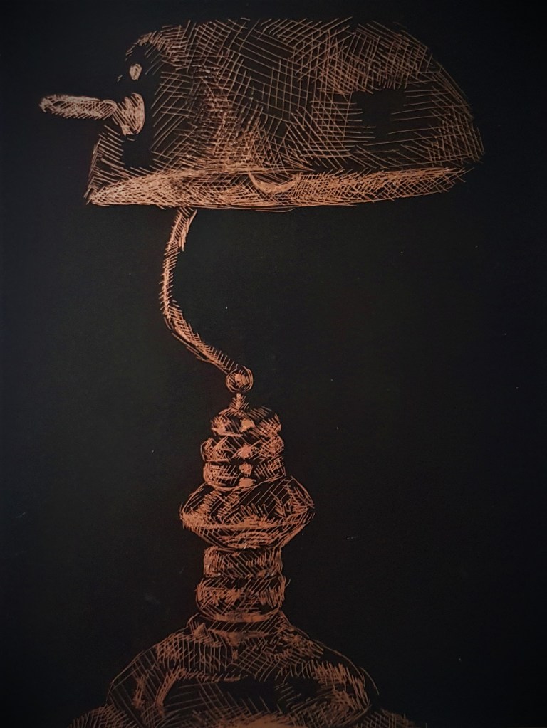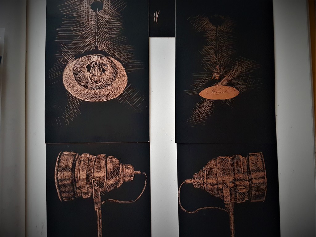 Moving on, I began experimenting with another idea of using the copper etchings as a effectively show use of tone in a unique way, due to the shine of the coper foil. I like the way I can show the shine of the light from the ceiling lights in a much more natural and more effective way, its way more subtle than how I did it with the ink. In terms of choosing between the floor and table lamp for my second object, I think lamp[1] has more interesting details than lamp [4]. Furthermore I think the lamp shade from drawing [4] is too bland and not as interesting tonally as lamp [1] with the metallic head.