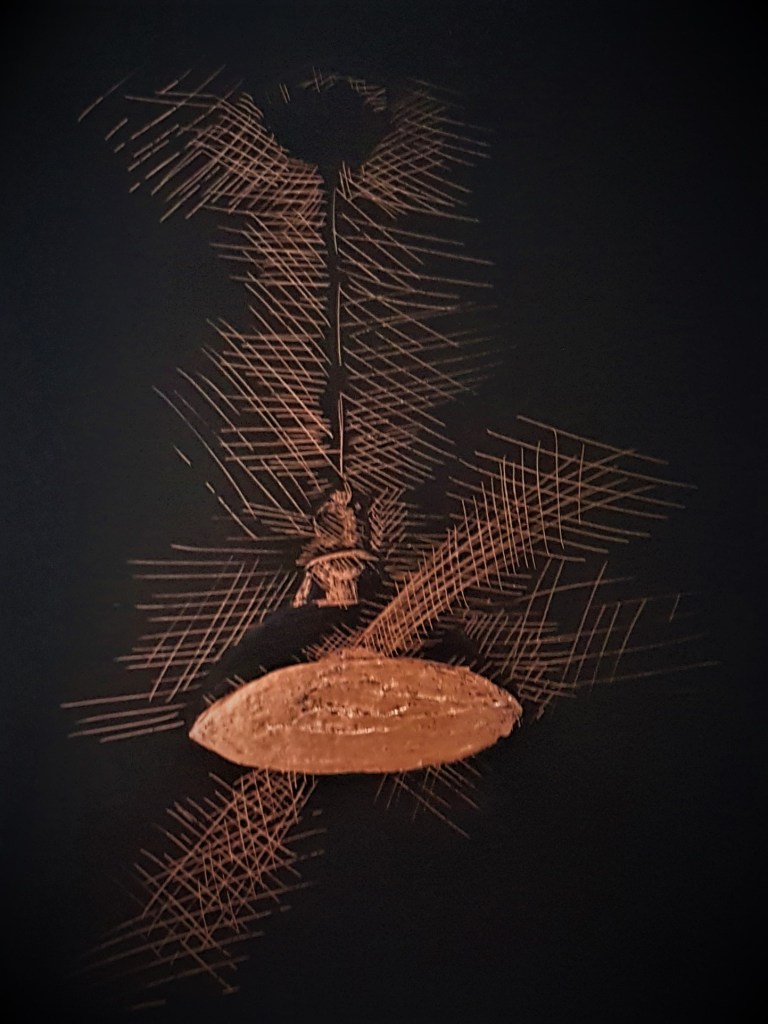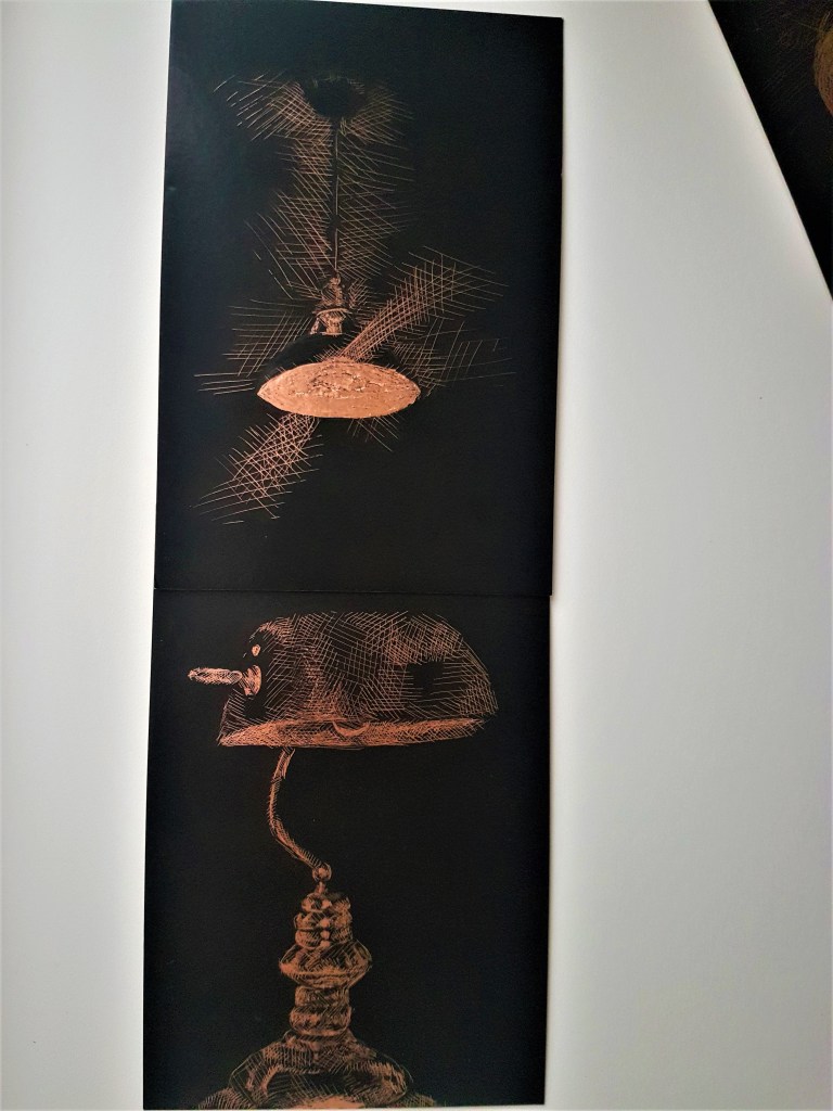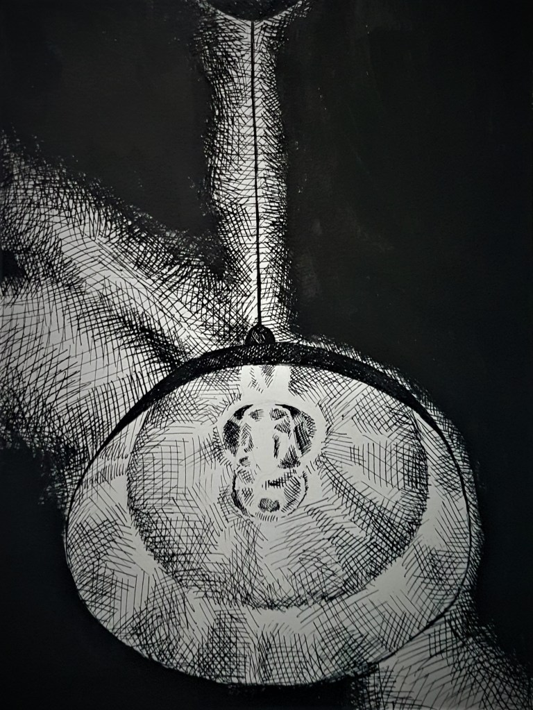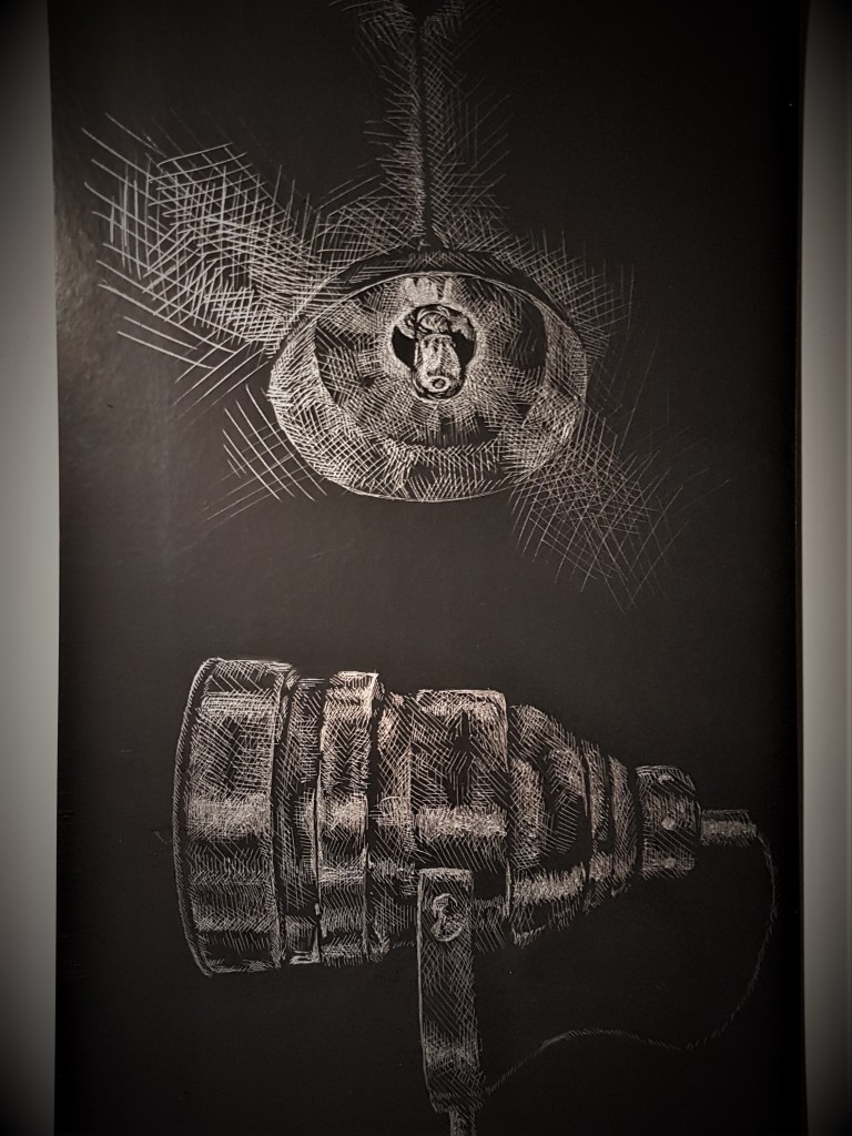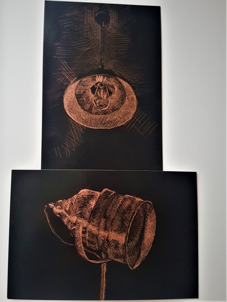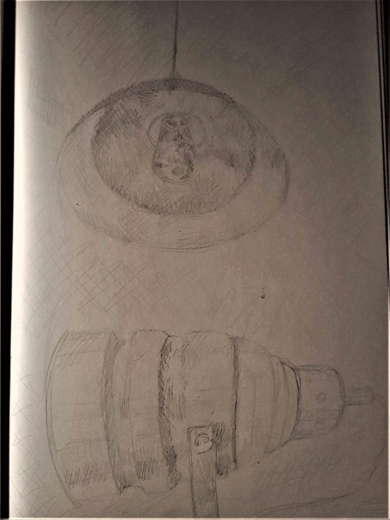 I went for a silver foil card, in order to creating a bigger contrast between the black background and my markings, and cropped the card so my two chosen objects were much more centre. I think I could have improved on the bottom lamp by having more areas of shadow to create more detail, as for the ceiling lamp, I regret adding highlights to the outside shade, I feel it would have been a more effective use of tone to not highlight that area. I do love the way I captured the rays of light flaring from the ceiling light, and highlighting the cord of the ceiling light. I think I did well at creating a mysterious, foreboding atmosphere, in terms of my markings, I feel they’re very calming and smooth. I’m happy with the finished product and the process to getting it to this point.