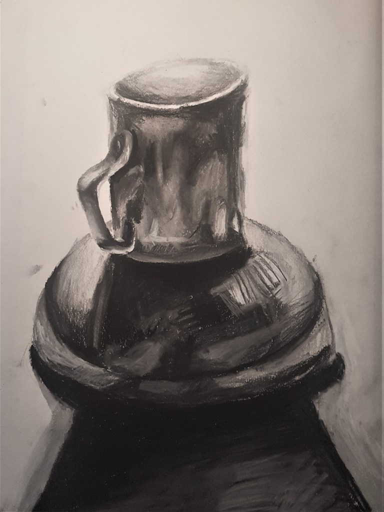 I am very happy with how this came out, although the proportions of the lip of the mug are a bit skewered. I really like the shadows the mug made from being on top of the bowl, and how it created highlights around the shadow. I think the composition I created was an interesting one. I am not a fan of using charcoal, but I think having various tones of greys helped me to create much more interesting shadows. The putty also helped me to maintain straight lines and certain shapes. I’m very happy with how this one came out.