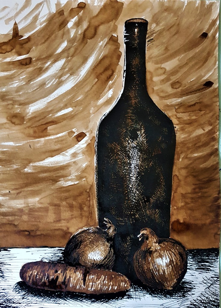 For this drawing, I chose objects similar in function and story, for example food and drink. I based my composition on one of the ideas for composition I came up with on Project 2. My aim with the composition was to build up height with the objects and have the viewers gaze follow it up. I used a long, dark bottle to fit with this concept and also to contrast with the smaller items in front. Since I went with a monochrome palette with strong shadows in my composition I thought it might be hard to distinguish between the different objects, so I used black ink and layers of ink washes in a walnut ink before using a lot of lines to add in detail. I began with using light washes of my walnut ink, layering them up somewhat for a bit of blocked in tone. I went in darkest on the bottle. As my Still Life reference for the bottle was incredibly dark I decided to go straight in with my black ink to capture this, building up my cross hatching to capture very faint reflections on the bottle as well as the dark tone. I used a similar technique on the onions and carrot, however using my brown ink to add the first few layers of cross hatching on top of my ink wash before adding the final details with black ink. I think looking back, I could have used more lines to define the carrot a bit more and solidify what it is. For my background I kept it simple to keep the focus on my Still Life objects, I created contrast by making the table white and using black ink to define shadows and tones.