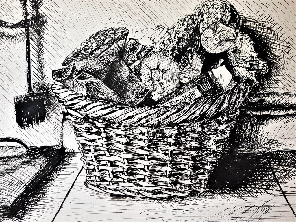 For this piece I told a story with my chosen Still Life focus, a basket of wood and fire lighters, and the side of a fire place, blending the purpose of the focal objects with the background. It relates. I relied only on my black ink cross hatching to depict the objects and tone and I think it worked well. I enjoyed using my lines to capture the pattern and texture of the basket, and also the shadows cast by the light. I altered my technique when it came to applying texture to the wood, using squiggles rather than straight lines, in order to show an uneven log texture. I kept my viewpoint straight ahead, so perhaps in later exercises I should consider looking from different and more unique angles and see how that changes my composition style.