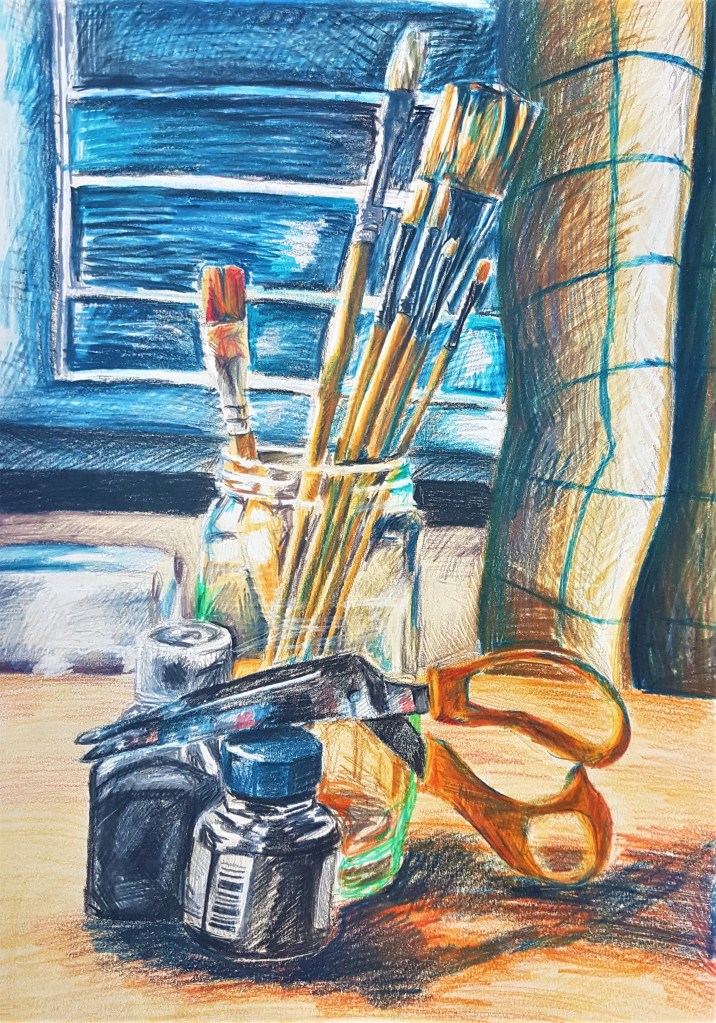 I find the background feels much more dynamic this time around and has a lot of depth to it, it works hand in hand with the focal objects rather than feeling more separate. I think this style and medium of coloured pencils works really well to capture a Still Life scene effectively, however it is a lot more time consuming than my previous mediums. I think the colours work really well to add a sense of depth and bring everything together. I found that working solely with tone rather than focusing on line, creates a much smoother drawing, with not as much detailed texture, though I found this worked well with the metal and glass textures that I chose for this Still Life. It affected my method as I was shading in big blocks of colour rather than taking my time to plan out lines to best shade an objects, but I do like the end result, I think it works well together.