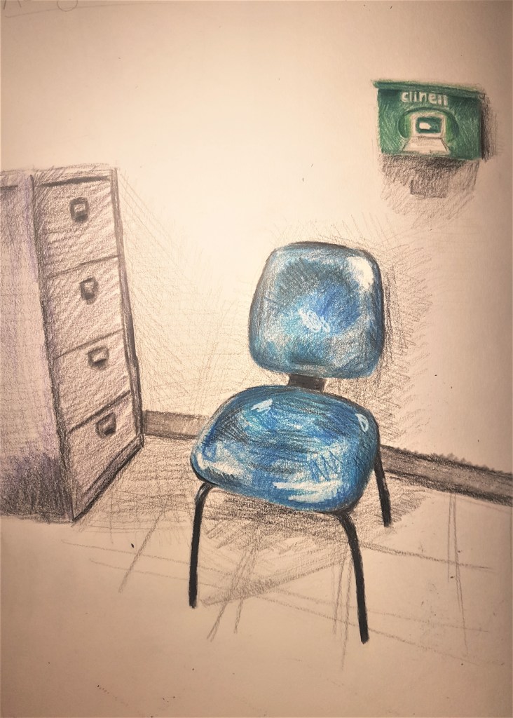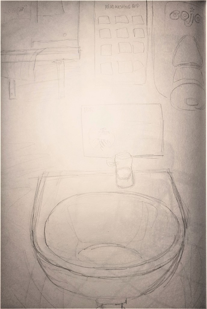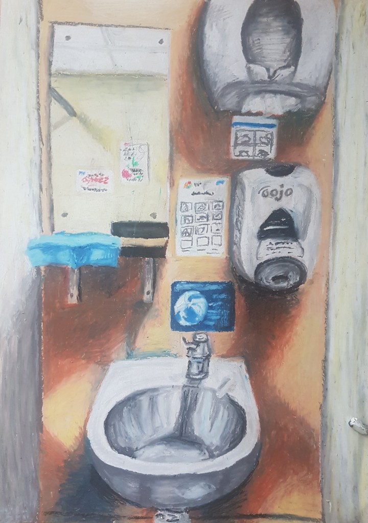 I think I captured the shapes well in my composition, the colour however I feel I ended up saturating. Its a lot more vibrant and intense than I was expecting, but I think it works well to a certain extent, the shadows can look a bit too much and out of place at times. I like how its loosely blended together with a fluid style that I wanted to achieve, it works well, especially with the posters above the sink. I think I captured the blue one just right to show the washing hands logo, and how the writing isn’t readable but just soft markings. They add to the narrative of rules and regulations of hygiene, especially in a ‘sink’ setting. So I think oil pastels were the right choice for this piece, in order to portray the atmosphere and colours I wanted in a loose fluid style which I’ve grown to love. Looking at the depth of the piece, I think I’ve done well to show my view point of looking straight ahead but could have used some more defined lines in order to show this more effectively.