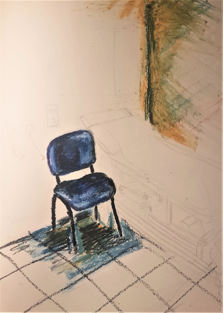 For my assignment I wanted to continue looking into interiors as I enjoyed it and wanted to experiment with it further. With current events I wanted to look into the hospital rooms at my local hospital, where I work. I thought that the rooms had character despite the simple professional look, and how sad and lonely these times can be and the importance of hygiene and health. So unfortunately with my chosen subject matter I had to work from photographs I had taken. I sketched out some possible compositions and tested out whether I wanted to use colouring pencils or oil pastels. I much prefer how my colours came out in sketch [1] however I just though oil pastels would be best with creating a loose fluid style, that shows the rush in a sense of these times. For my composition I ended up settling on sketch [3], although it wasn’t drawn the best I loved the simplicity of the composition, and how everything fell into the tan bit of the wall, and how the sink pops out in the bottom centre. It also portrays the message everyone has been told, to consistently wash our hands, so I thought I would be a good narrative within my composition.