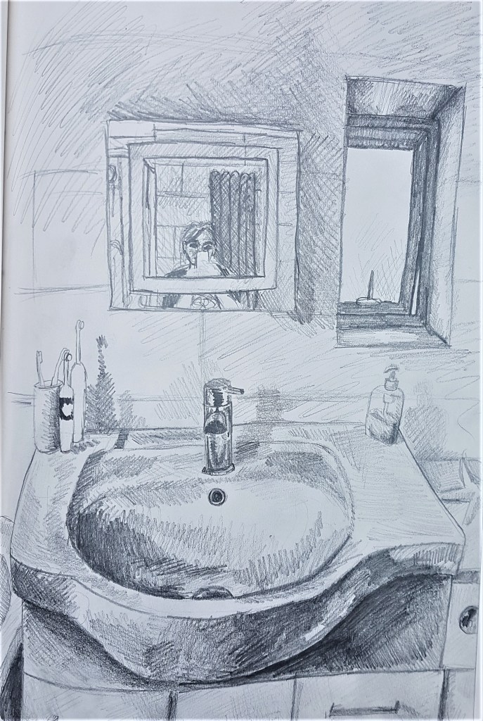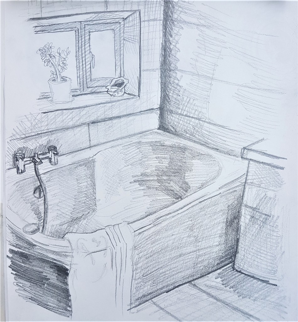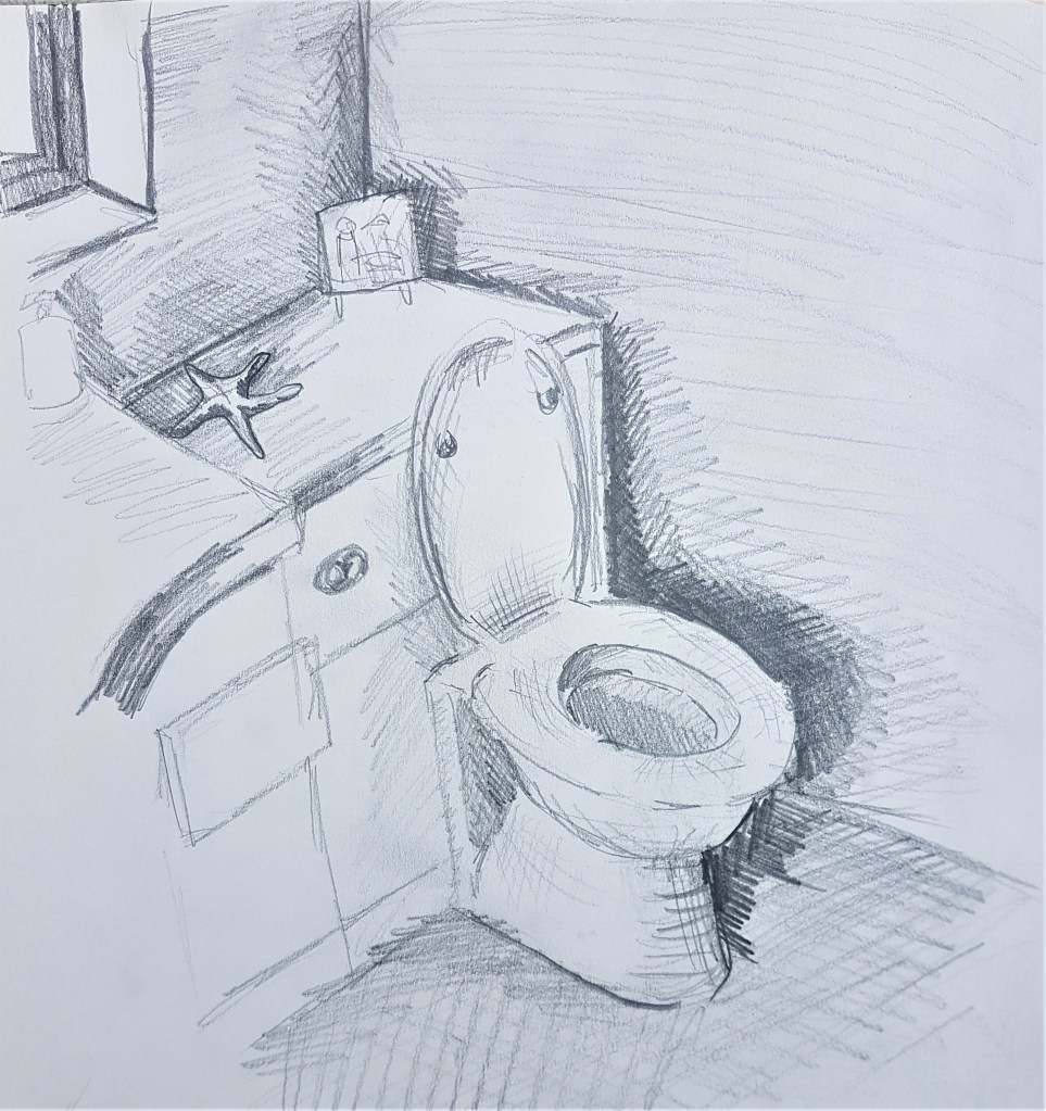 For this exercise I began in my bathroom, doing live drawings from different angles in the room, moving around as I quickly sketch what I see in my sketch book. I found it quite refreshing to not be focusing on the detail but my observational skills, quickly depicting the room, the lighting and the shapes that make up the space.