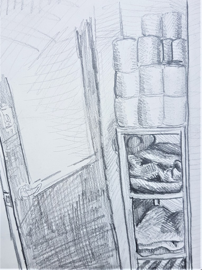 I quite liked how these drawing came out, it was a huge change of pace to focus on loose drawings capturing a larger scale still life, a room, and I really enjoyed the process and looking at the different angles. Although I feel in places my proportions are slightly off, I do love the looseness and experimentive markings in live sketching. For the second drawing, I did need to resort to using a photo reference as well for how I wanted the composition to be underneath the viewer to have a better view of the sink and due to the lighting fading in and out.