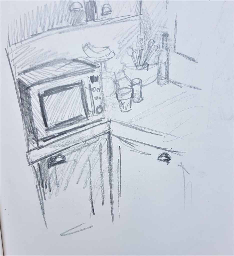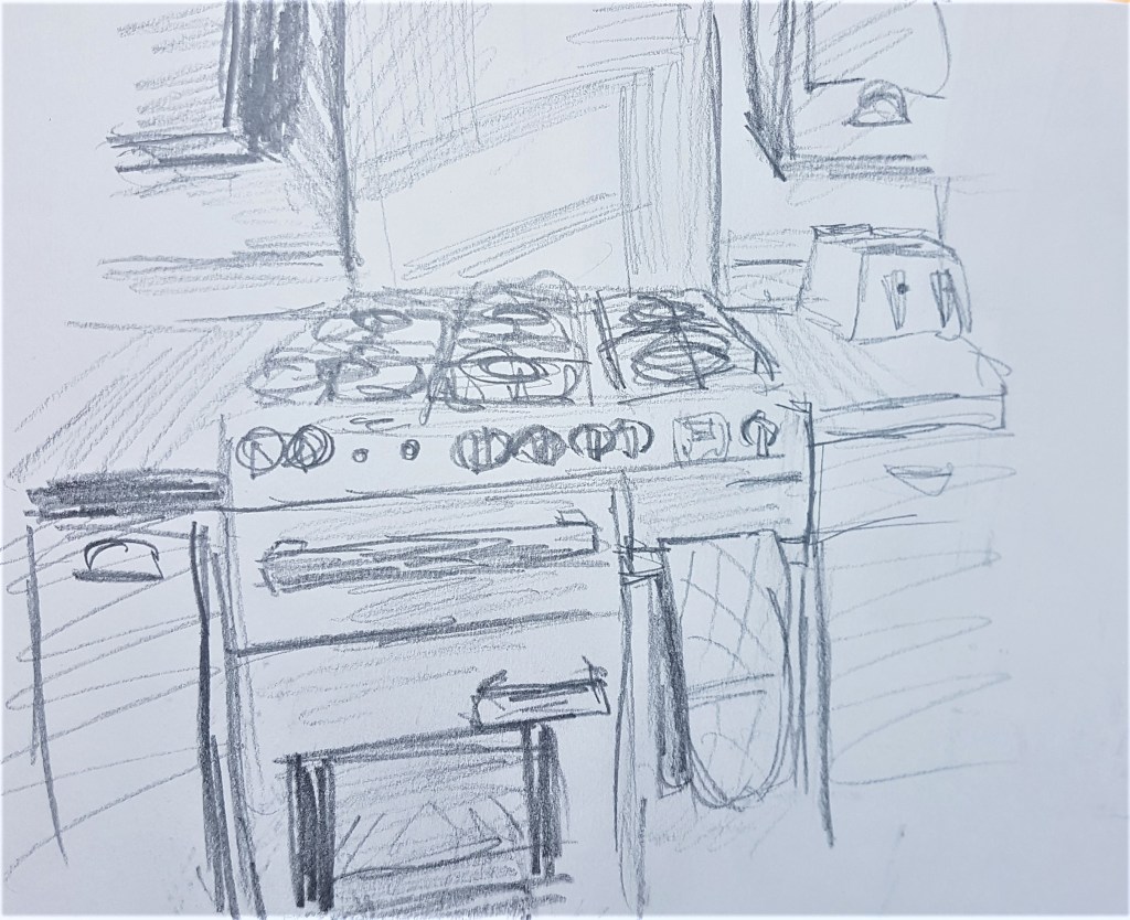 I found timing the sketch really helped me to focus on the shapes and lines of my drawing, and how effectively I was showing the room, I barely used tone, which was good for me to know I was focused on the area that I wanted to be. For sketch [1] I gave myself 5 minutes to draw, which you think would feel longer than it is, but its a really short amount of time, however, I manged to get in all the details of the oven (loosely).