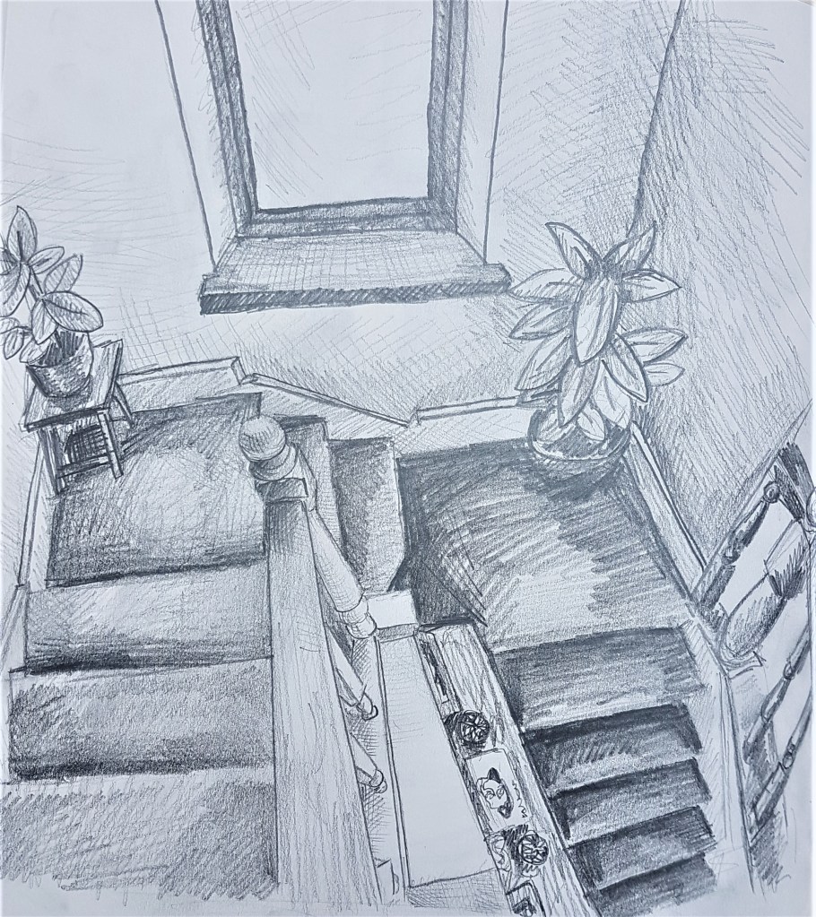 For sketch [1], I looked at trying to include the whole scene of the stairs, I think where I went wrong was my perception and point of view, I think it was too low down to include everything I wanted to. I also skewered my perception a bit too much to where I couldn’t fit the bannister in right, so I ended up leaving that area blank. I feel this kind of works in the sense of creating a much more open space, rather than a complex one. However I learned from my mistake and altered my viewpoint for sketch [2] and chose a higher point of view. This worked better for fitting in the stairs as a whole and creating a satisfying scene. I then blocked in tone and a bit of texture for the bookshelf, I really love how the bannister and bookshelf came out, they add a bit of character and complexity to an otherwise simple scene. I found preliminary sketches to be quite useful for figuring out and planning a composition, as I feel ready to tackle exercise 3. These exercises were useful in getting me to think about the shapes of a larger scene rather than the intricacies. As planning a larger scale drawing, as these exercises have been leading up to, is about the shapes and the composition, and learning to take time to focus on that has helped me think through what I’m producing more.