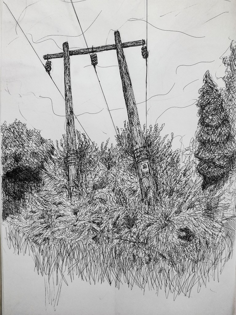 I really wanted to capture what the exercise talks about in the first paragraph, to capture the ‘most striking feature’ . I wanted a point of interest that could stand out against the trees within my composition but also help draw the viewers gaze in and then out to the trees surrounding this focal point. I thought this could help create an interesting drawing that doesn’t feel to crowded with all the similarities present in the structure of trees. I did think about maybe incorporating a contrast with my choice media of a fine liner pen with oil pastels, but I ended up preferring the more simplistic take with loose lines forming a monochromatic, observational sketch. I found a good composition on my walk, an electrical pole surrounded by trees and decided to get to work on this exercise.