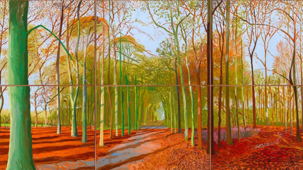 Hockney, best known for his paintings of pools has branched out to exploring the British landscape. In this change of subject matter his medium has also changed to a digital approach, beginning with drawing on his i phone and advancing to an i pad. He says that he can work much faster with a digital medium in order to capture his scenes. This can be extremely useful considering how fast weather, lighting and nature can change. His newer pieces focus on spring but I am drawn to this piece from 2006 which he brought to life again in a digital medium. I love the colours and use of line, especially the line work used to show the shadows cast by the trees at either sunrise or sunset. The use of orange tones helps inform us about the time of year, early autumn, which we can see from the oranges used to show the leaves on the ground but also from the light green, showing that a lot of foliage and signs of summer are still lingering. The use of line and blocked colour help define the foreground and middle ground from the background which can be difficult.