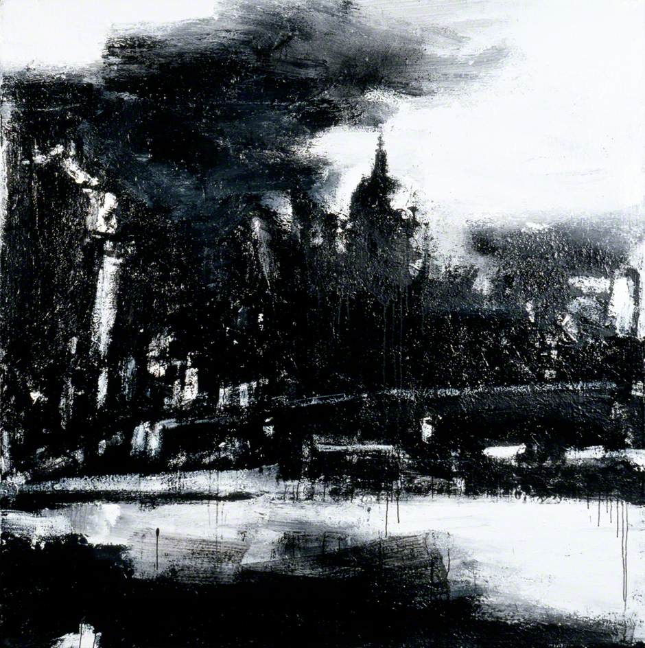 I really like the contrast with this piece compared to the other landscapes I have discussed so far. The focal point here isn’t the townscape but rather light and how it interacts with the scene. Initially it looks rather abstract, but the closer you look the more things seem to make sense and the view of London begins to form and reveal itself to the viewer. A mix of media is used here to create something starkly different to the usual landscape and the lack of colour adds to the industrial vibe one gets from London, rather than the soft colours and marks used to depict a natural landscape. This seems quite a harsh application of paint and ink which fits the harsher, industrial landscape of a modern city.