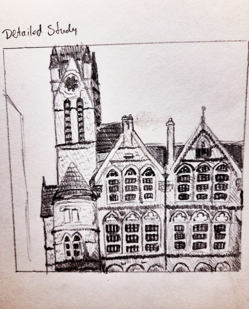 Since the layout of my chosen composition didn’t work well horizontally and was a tall composition, I stuck to one page for this study rather than two. I used line and focused on the shapes and proportions. I still applied tone to the main focal point of the Ikon gallery, and kept the other building in my composition very simple and basic showing the lines that made up its basic composition but no more. I thought this would help to showcase and depict the surroundings while not taking away from where I wanted the focus to be. I only kept to drawing the buildings, but I feel I could have added more detail and texture in the surroundings, especially the courtyard at the front with the gravel. I didn’t at the time to keep the focus on the buildings, but I feel this could have helped create a more interesting and dynamic drawing. I know for my final piece, I want to explore this composition but keep the focus higher, like in my original 10cm square drawings, but I would like to try and include the building on the left, and experiment with keeping that in minimal detail compared to the main building.