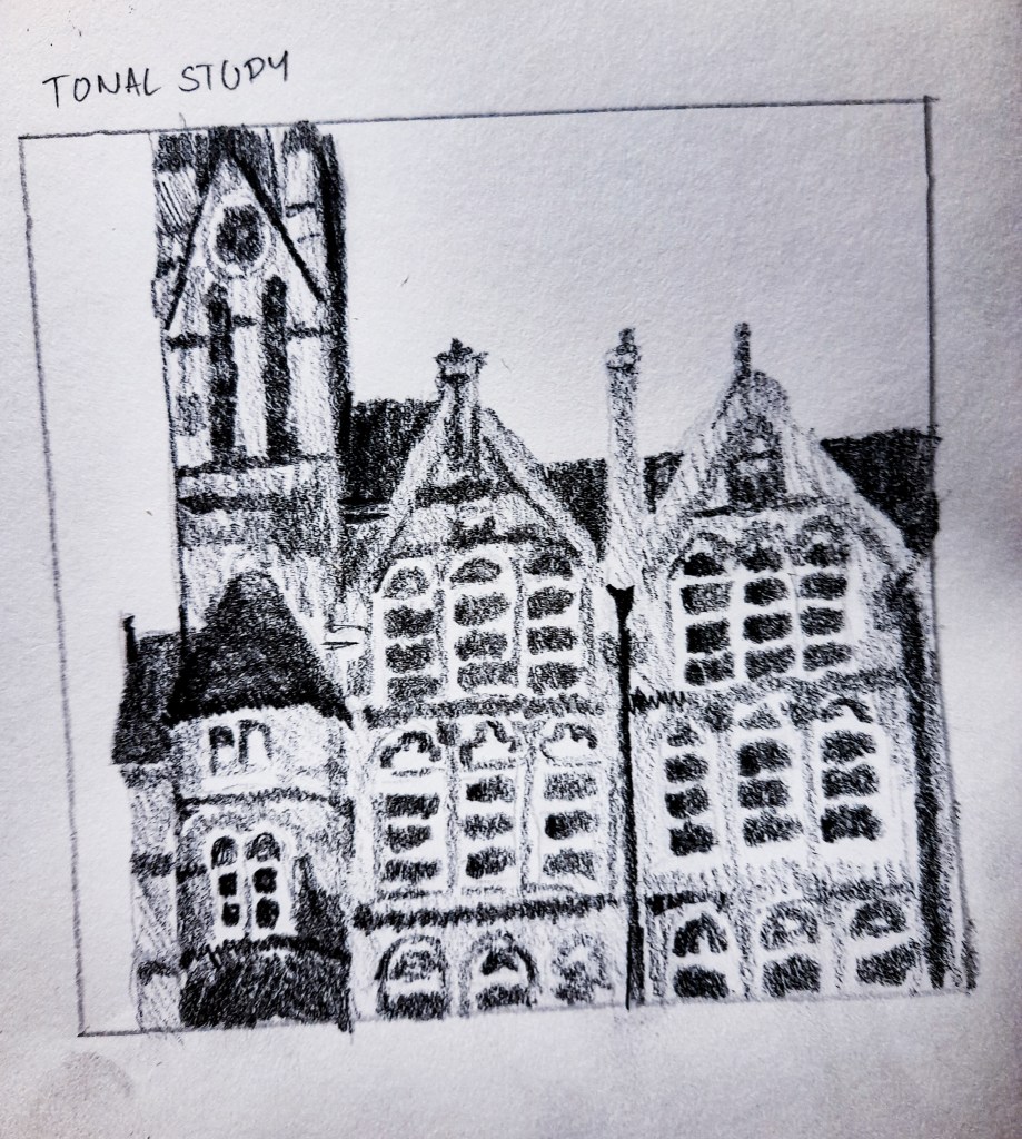 I focused on a small areas above the entrance which showed the roof line and the windows. I love how this looks and it helped me get to grips with depicting the architecture. It was heading to the evening, so the sun was getting low and casting interesting shadows onto the round turret at the entrance. I found this building to be interesting, lots of details and windows, I wanted to explore a complicated building for this exercise to really test my skills and hopefully improve. I think I prefer my tonal approach to this drawing as it captures more texture with the 3B pencil and the grain of the paper.