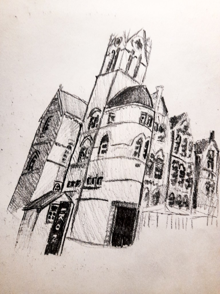 I tried a new angle with this quick 10 minute sketch, I was limited from angled to choose from due to the tight space around the gallery. I kept a focus on line with this drawing in order to focus on getting accurate proportions with my drawing and I think I have achieved that. I was happy with how this came out, but I preferred the focus from the front, where I could capture all of the details and the layout of the windows. I think it was more interesting and i wanted to explore that composition with ink.