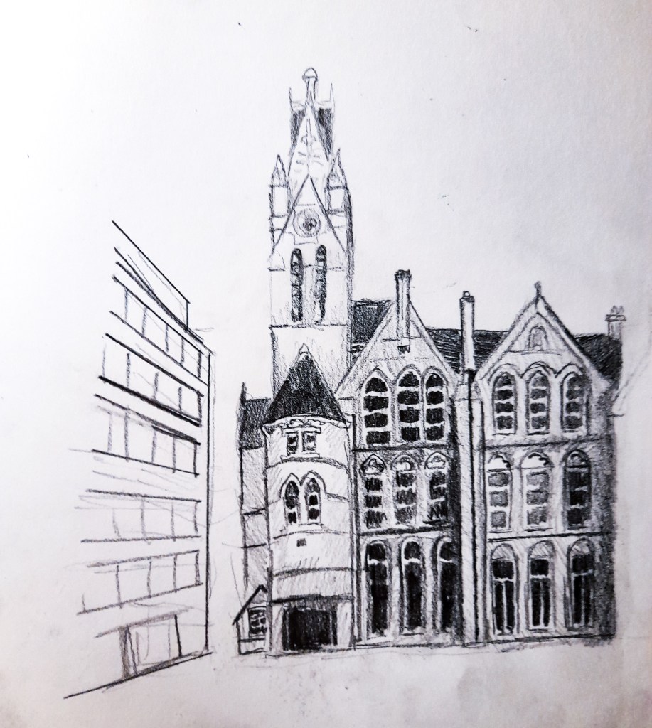 For my townscape I decided on Birmingham, and ended up at the Ikon gallery. Since the exercise asked me to focus on a specific building, I decided that the architecture of the gallery’s exterior was perfect and sat down to begin sketching.