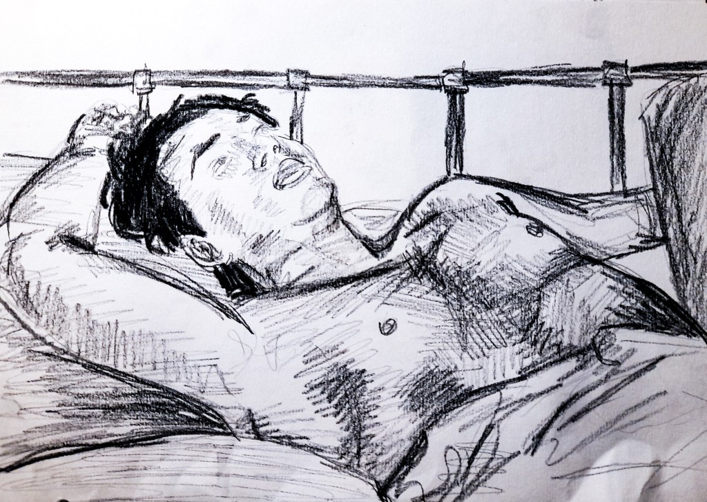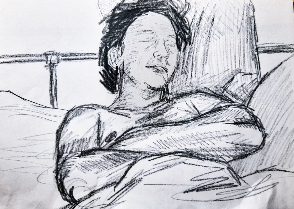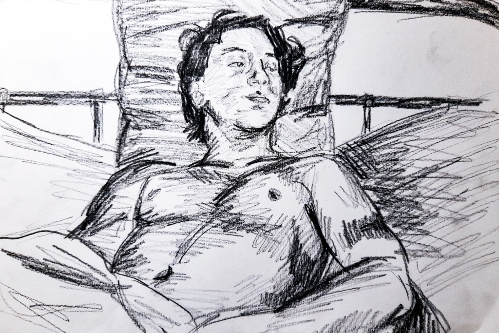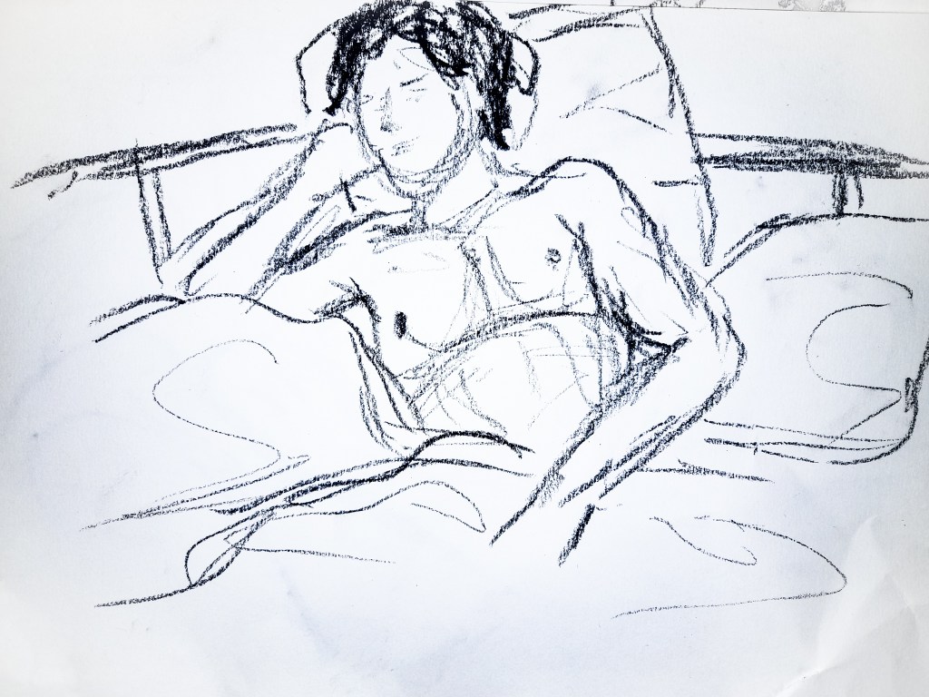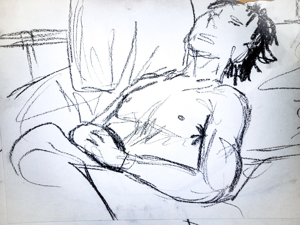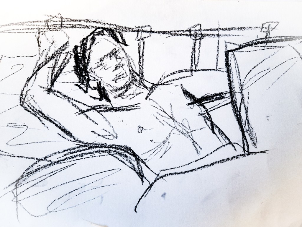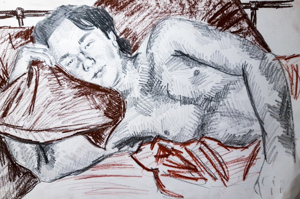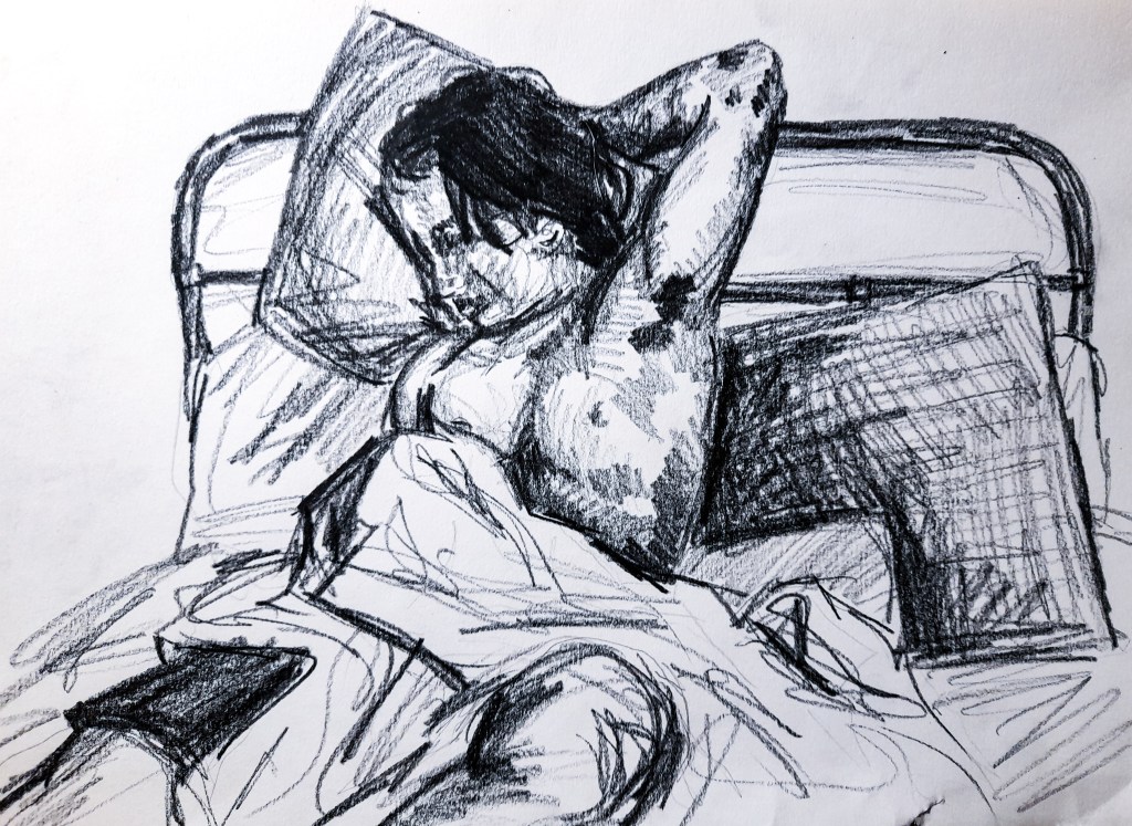 My first drawing is definitely an improvement from the 2 minute sketches, but a lot of work still needed to be done to really improve. The face, although is better than my attempts within a 2 minute time frame, still needs work. Since I was working with an almost side profile, it wasn’t the easiest to accurately capture in a 10 minute time frame. I am however really happy with how his body came out. I think I got the proportions accurate with his arm and chest, but I am unsure about how well I did with capturing his legs peeping out of the blanket at the bottom. I had more time to create a sense of place with the background, capturing a lot of the bed, though I feel I may have slightly squished it in. I really like what I managed to do with my use of tone, I think it really brings the composition together.