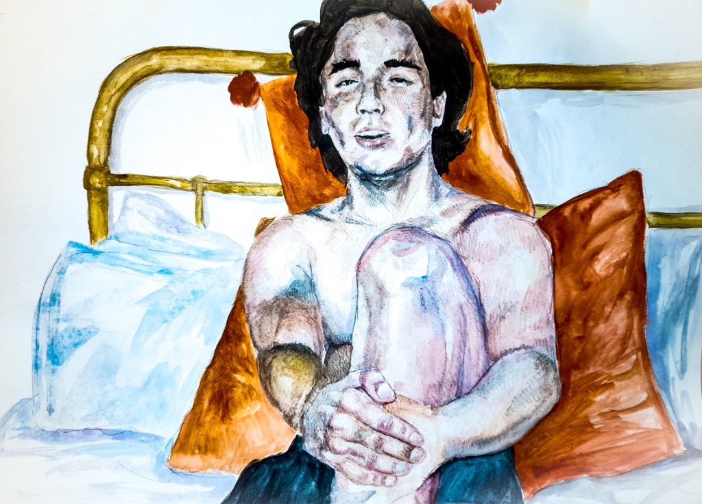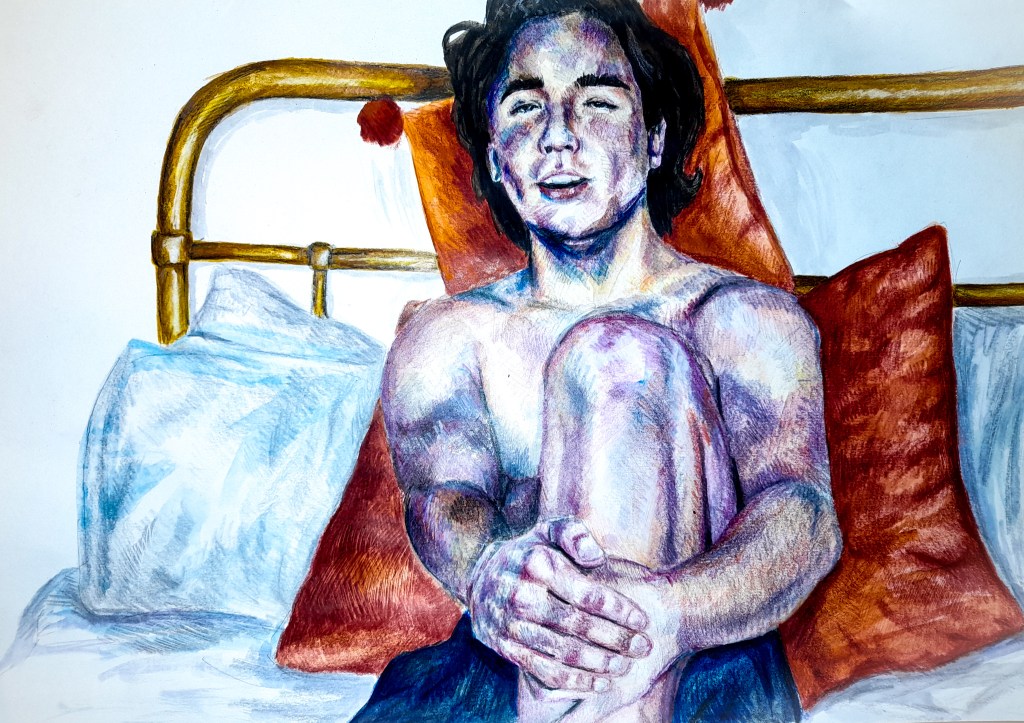 I think I did well capturing the body and the pose, it was something a little different to my previous quick sketches, and I think it’s interesting and works well, I just wish I picked a pose with more of the chest showing, as I love the curves and shapes of the torso with drawing. I feel the body does look to hold weight in the drawing, the orange pillows help emphasise his presence within the image. You can see them curve and crease as he leans on them, showing his presence, his body has an effect on his surroundings which I do like. However with all the cool tones, I feel the orange pillows may be out of place in terms of colour, although that is true to the composition and view I had, the colours just don’t seem right. Maybe I should have exaggerated the surrounding colours of the white bed sheets or picked different coloured pillows. I should experiment with lighting, by using a lamp I could bring out warmer colours which would match better than the cooler colours brought out by the natural lighting.