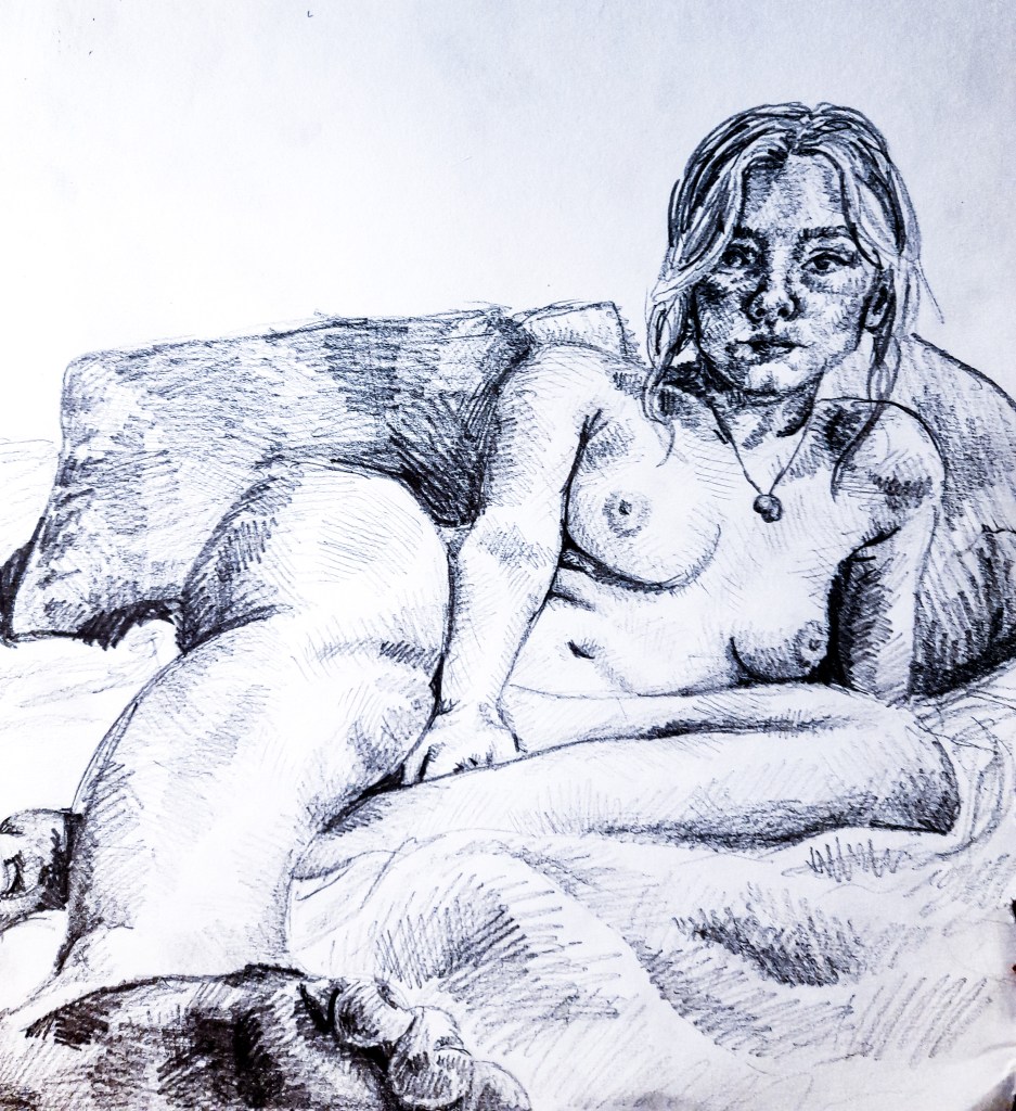 For my first look at trying a foreshortened composition I looked at myself in the mirror laying on my bed. I did it naked in order to really look at the shapes of the female body, since I haven’t been able to get a female model. The angle makes the drawing quite dramatic as the proportions have been changed to a skewered perspective. It adds a line of focus, drawing the viewers gaze in from the enlarged foot, to the chest.