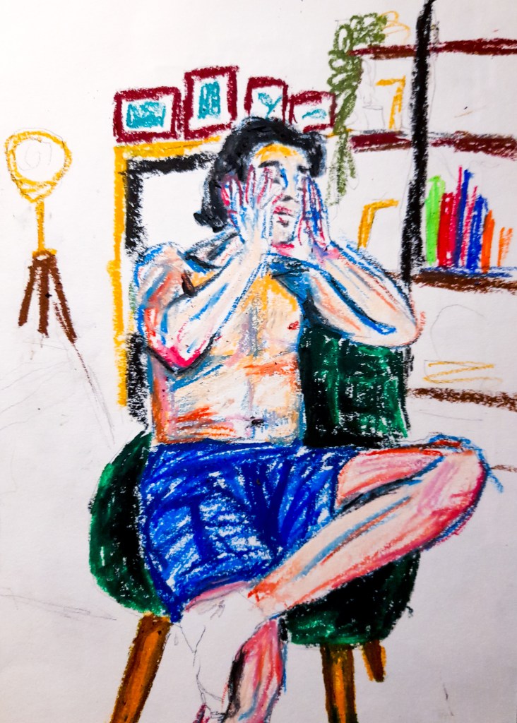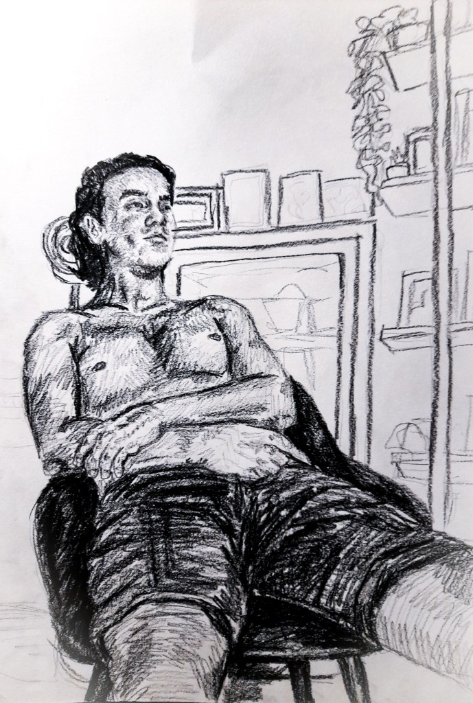 For this drawing I got a bit more experimental with my drawing medium. I used bright colours with oil pastel for a more stylised drawing than one focused on realism. It allowed me to be a lot looser and focus more on my use of lines than tone. The background furniture, again, created a sense of space and proportion for the body to relate to, it helped me get his sizing and proportions right in relation to the chair and area around him. A triangle shape is again formed in this piece, that draws the viewers gaze to the head. However the shape takes place within the models arms rather than his legs. A triangular shape is formed separately in his legs due to him crossing his foot onto his knee, but it remains separate from the head. The torso shape can be seen to be more definitively as a square in this drawing. The shapes that make up the body are more easily seen do to the focus on line over tone. I think since this piece is larger than my previous oil attempt, it works a lot better, so an even larger scale could work more effectively.