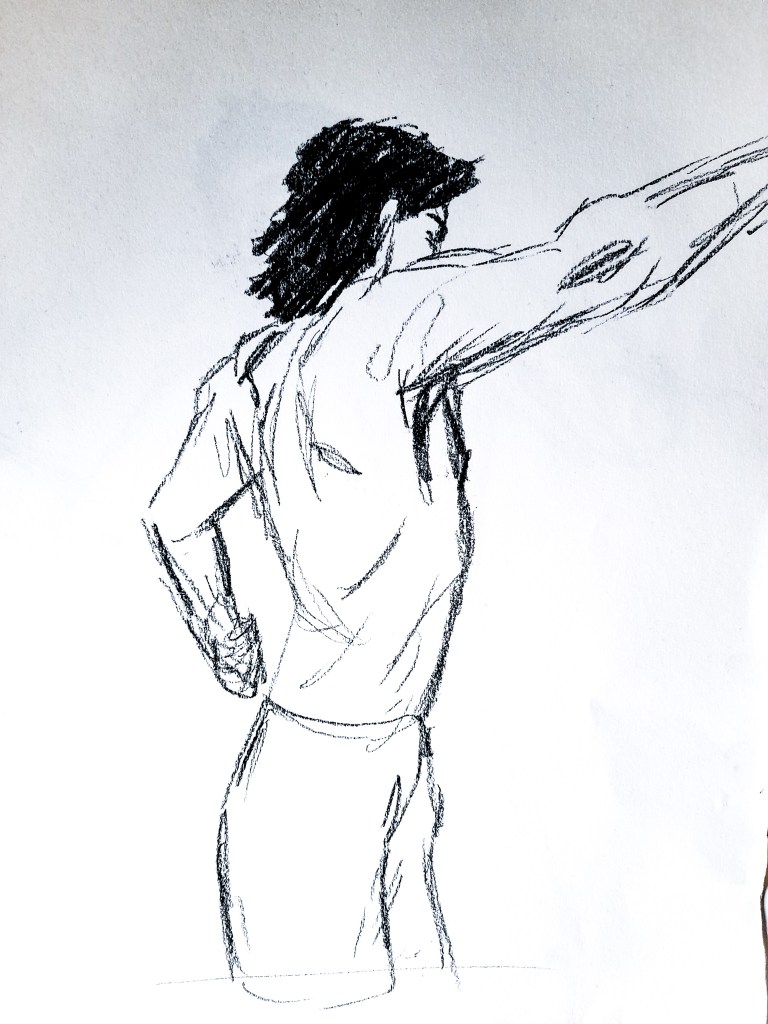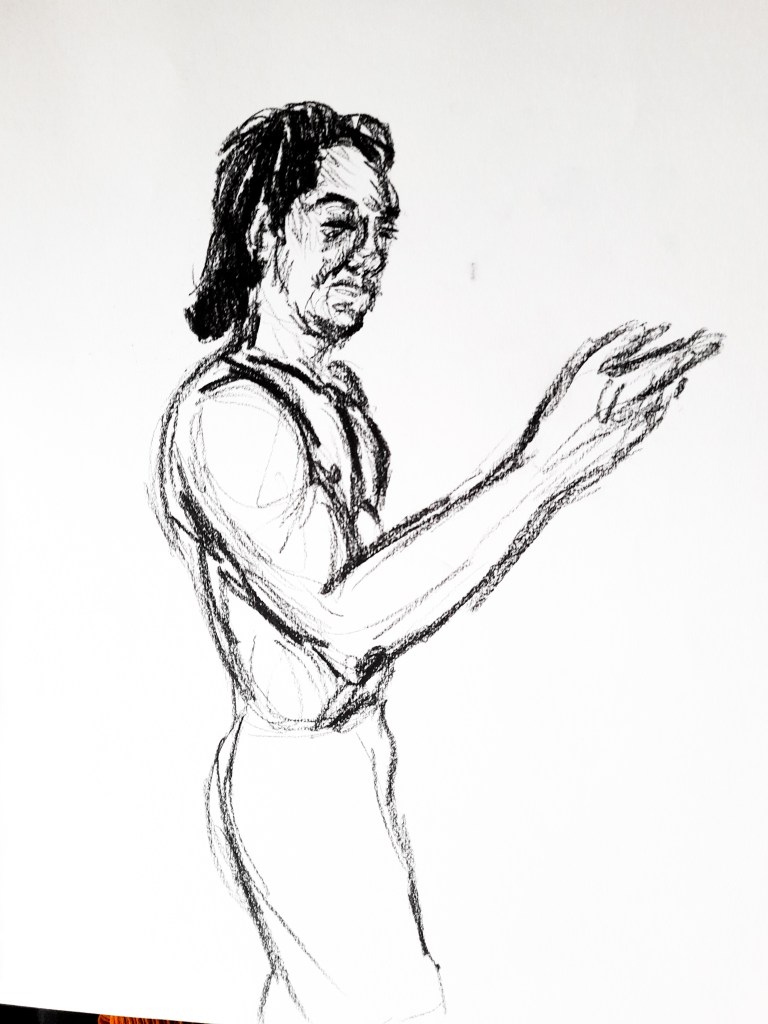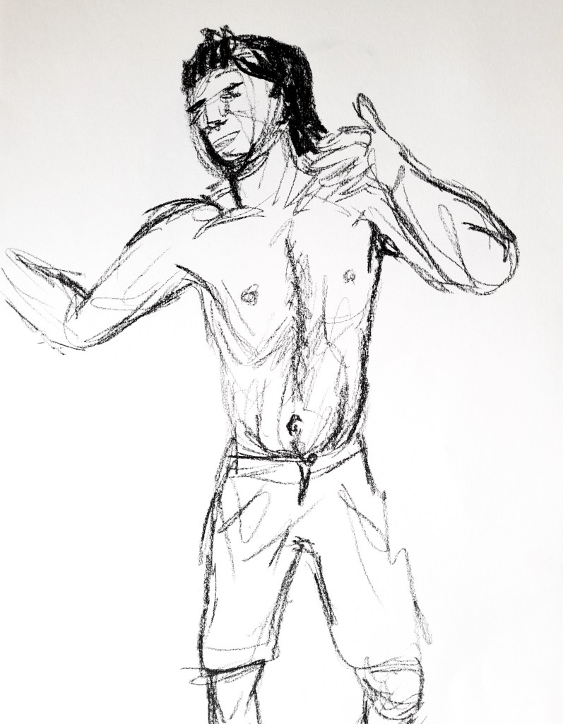 I think that this is definitely the best drawing I have done out of the set, and I am happiest with this one. The posture and sense of weight is present throughout the body. I think I capture the arms really well and their sense of movement. My use of lines also captures the shape of his back really well. The legs look a little off, and I could have worked on them a bit more to really get a sense of the movement throughout the entirety of his body. You can see his posture twist through his chest and hips, his movement is almost like he is swinging a punch. I love my use of line with the charcoal here, it works well, loose like flowing water. I kept to quick, rapidly drawn lines to help create a sense of movement, short and quick to mimic his dance moves at the time and I think it works quite well.