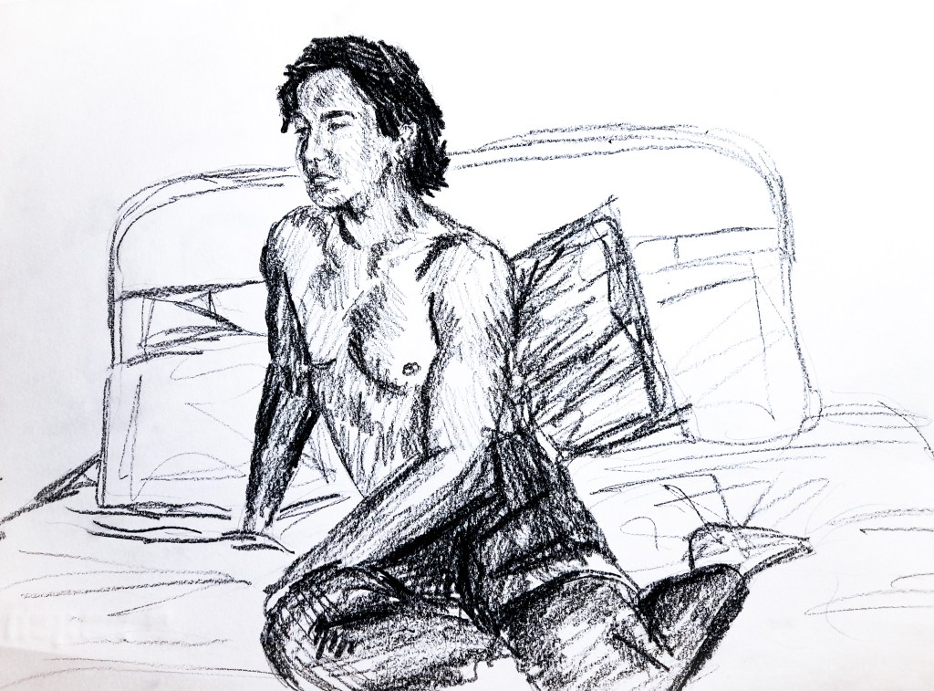 For this exercise I was to draw 6 different poses, each in 10 minutes, very similar to an earlier exercise. I set up a light to the side to create shadows and tone from the curves and shape of my models body, which worked quite well. I had him take up a variety of poses on the bed to get a better look at his body and proportions as so far my focus has remained around the waist up.