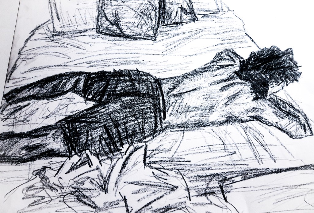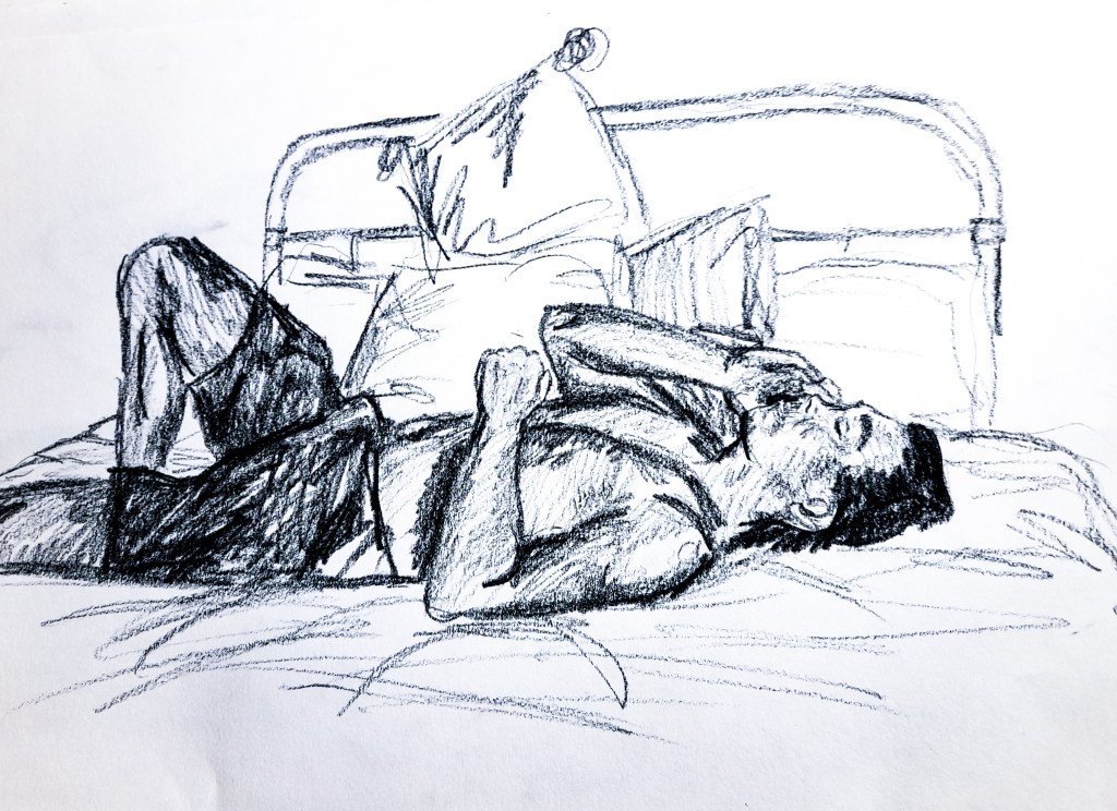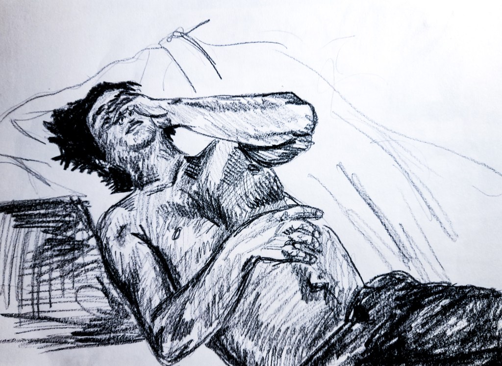 With these three sketches, I looked at changing my perspective to something more aerial, looking from above. With this point of view I get a new look at how the light cascades over his body. I think in these three sketches, I was able to depict a sense of weight to the body much more effectively, possibly due to the viewpoint of looking down on the model. I think my fourth drawing here shows the best sense of a pose. It has weight to it, you can see the heaviness of his arms and posture as he holds them up. Again I feel all of my sketches show an accurate portrayal of his proportions, and with my sixth sketch, I found I had a bit more time to explore the surrounding environment of the model, and sued tone to shoe his weight more effectively resting upon the bed. With my fourth sketch there was an obvious gesture away from the central axis with the models arms and shoulders leaning away from his body. I feel I identified this within my sketch with how I used line to present the arms, and tone to show the shadows highlighting this movement in his body.