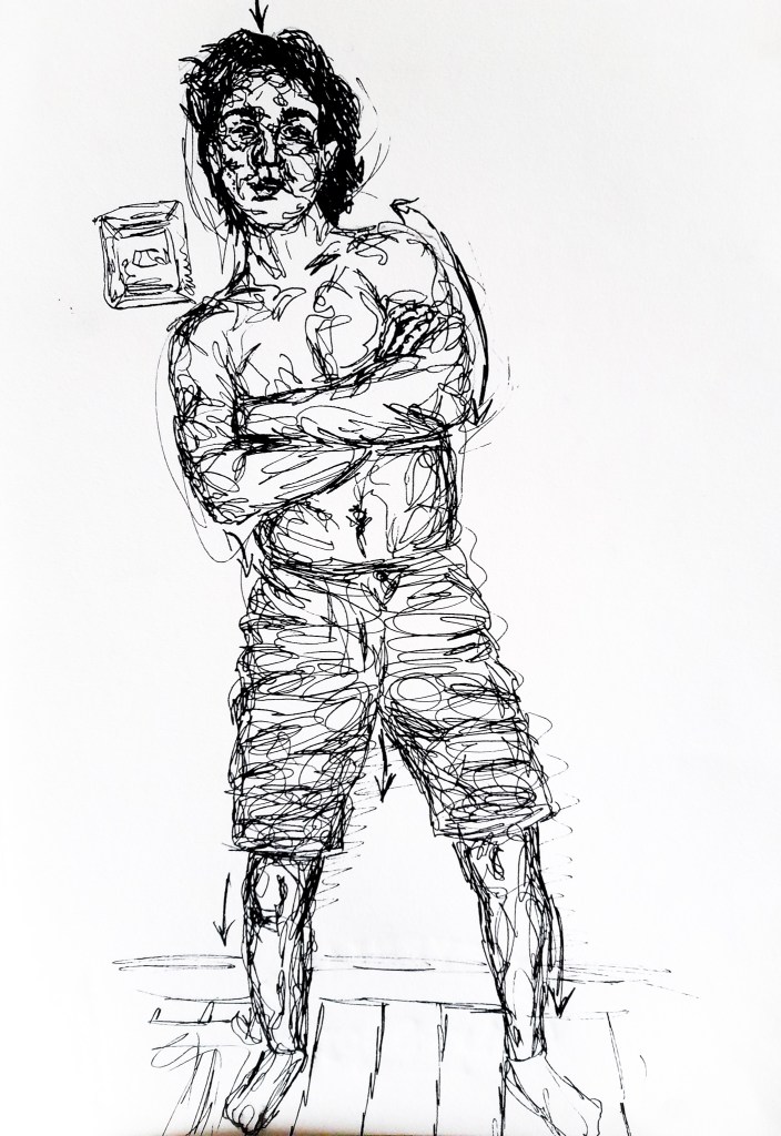 With my depiction of tone, I used line to help create a sense of light and dark around his body. I feel the loose lines work well to convey tone on his body but not so much on his face. The face, I find, is quite delicate and difficult to portray when not the main focus of the sketch. Especially working on a short time frame, the bold pen lines confuse and add too much detail to an already very detailed part of the body. With the body, I think used enough line to create a good depiction, without overdoing it.