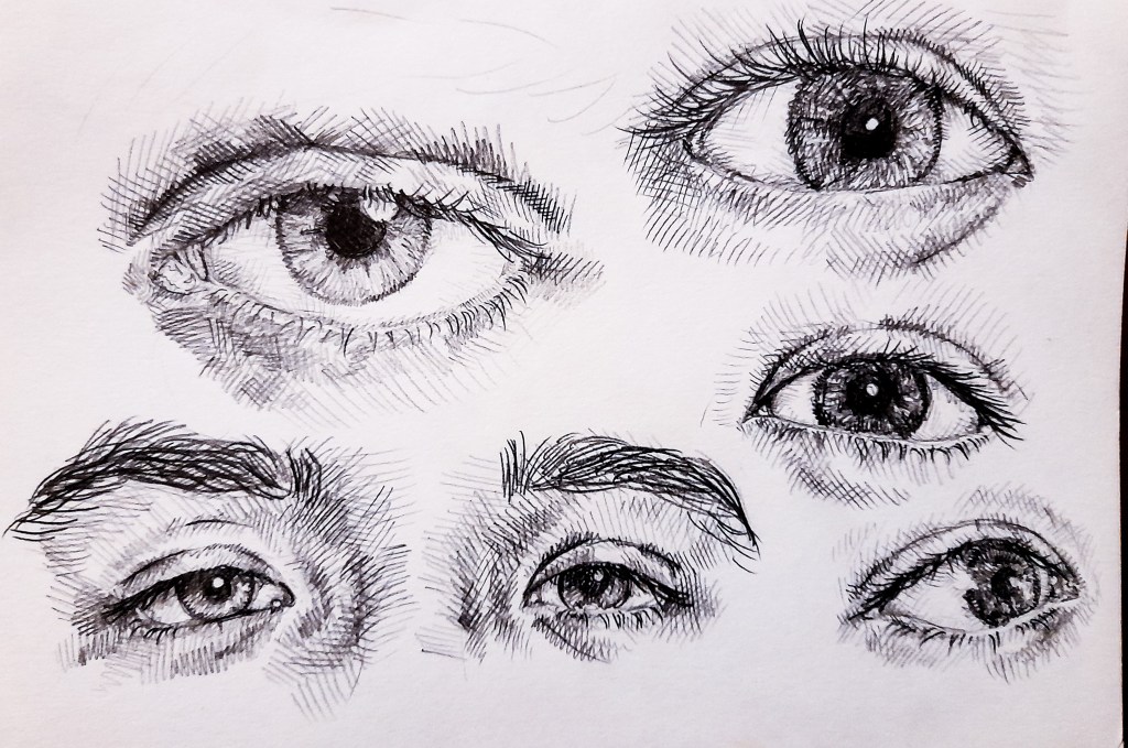 I began with the eyes, sketching out the basic shape and used cross hatching to add tone, curving the lines to add dimension and shape with my use of tone. I liked playing around with the reflections in the eyes and adjusted my light source with my model to get some interesting reflections.