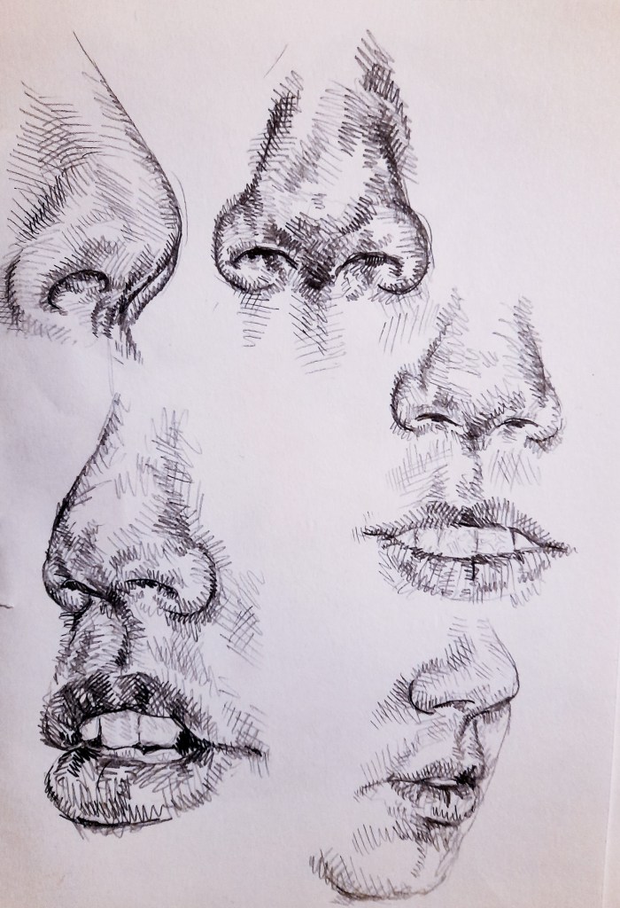 For me when I draw a face, I usually start with the nose, as its in the center of the face, if I can get the nose right, the rest of the facial features can then fall in the right spots. Again I curved my crosshatching to depict the shape of the nose. For the mouth I try not to outline the lips and use shading to show the start of the lip colouration. I think the bottom two attempts depict my models mouth the best as I built up the areas around the mouth to help better show how it fits into the face. You can also see where I started to look at the chin. Since I was using my model as reference, his chin is very round and there isn’t much detail to it.