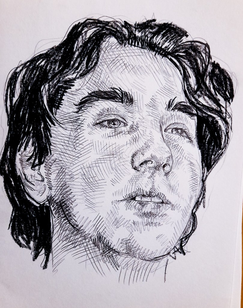 I kept to a smaller scale with this study and began with a mechanical pencil to draw in all the details. I began with the nose, as I said earlier, its the center of the face. If I get the nose right I find all the other features fall into place. I curved my lines with the shape of the face to help add some dimension to his face. I moved onto the eyes which aren’t as soft as I would have wanted them to be, I feel in this study I have made them look more outlined than tonal. This might be due to the small scale, quick sketch. I moved onto the mouth which I am rather happy with, I used tone to develop the colouration of his lips, and avoided outlining them. When it came to the hair, I switched up my media to a pencil lead stick to more effectively depict his dark hair, leaving some areas white for highlights. I think I captured the shape and size of the head fairly accurately, and feel all the facial proportions are correct. I wish I captured his eyes better but that allows me to improve with my next drawings. I found this exercise useful to really sit down and think about the shapes and tone of the face. I usually struggle with drawing mouths and found that my technique has drastically improved with working on this exercise. Taking time to center my focus on one feature at a time than the whole picture helped me to develop more skill at capturing the features of the face.