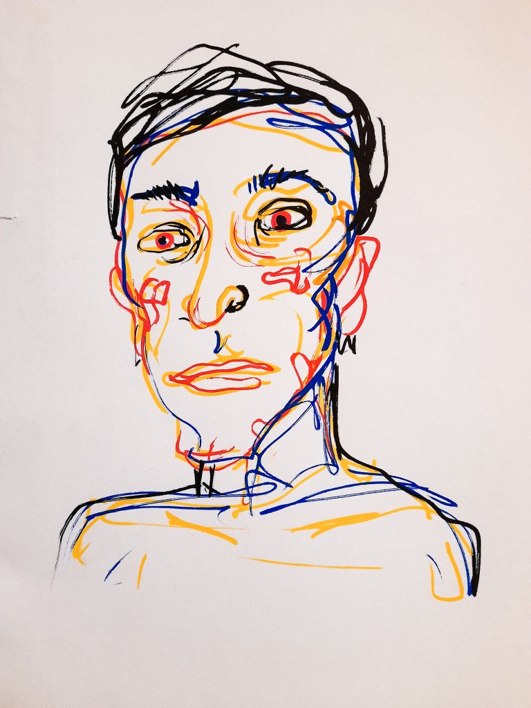 For this exercise I wanted to go with a more stylistic approach than aim for something realistic as the outcome is bound to be odd. I chose to work with my POSCA Paint Markers again as they’re bold and will make great lines, as I wanted the focus to be on line. I chose to find some ones face on my trip to Tesco’s and it was going to be difficult as with Covid a lot of people have their faces covered. However I found a man in the parking lot packing his car with groceries without his mask on and did my best to remember his likeness.