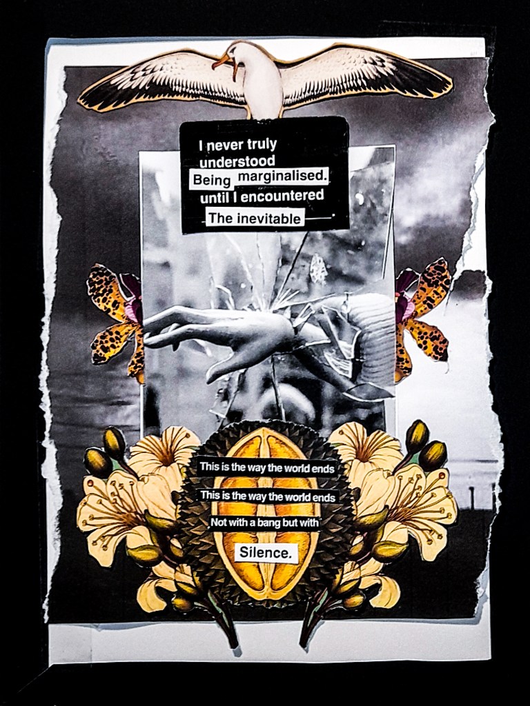 For this collage I kept a focus on the silence surrounding sexual assault and harassment. Using flower images from postcards, containing a dissected fruit that looks like and represents female genitalia. I kept a focus on the silence of female pain and trauma, mostly by men. There have been so many times for me where my male friends have stayed silent while I suffered harassment and assault, mostly due to the fact that I am not perceived as theirs. This is a generalisation, but I have found most men only care about women’s struggles and accounts when its a girlfriend or a relative, a woman who they are in someway possessing. The amount of times guys only supported me when they expected more than a friendship to come out of it and when they realised I didn’t want that, just friendship, they stopped caring, some even going as far as calling me crazy and siding with the men who were actively hurting me.
