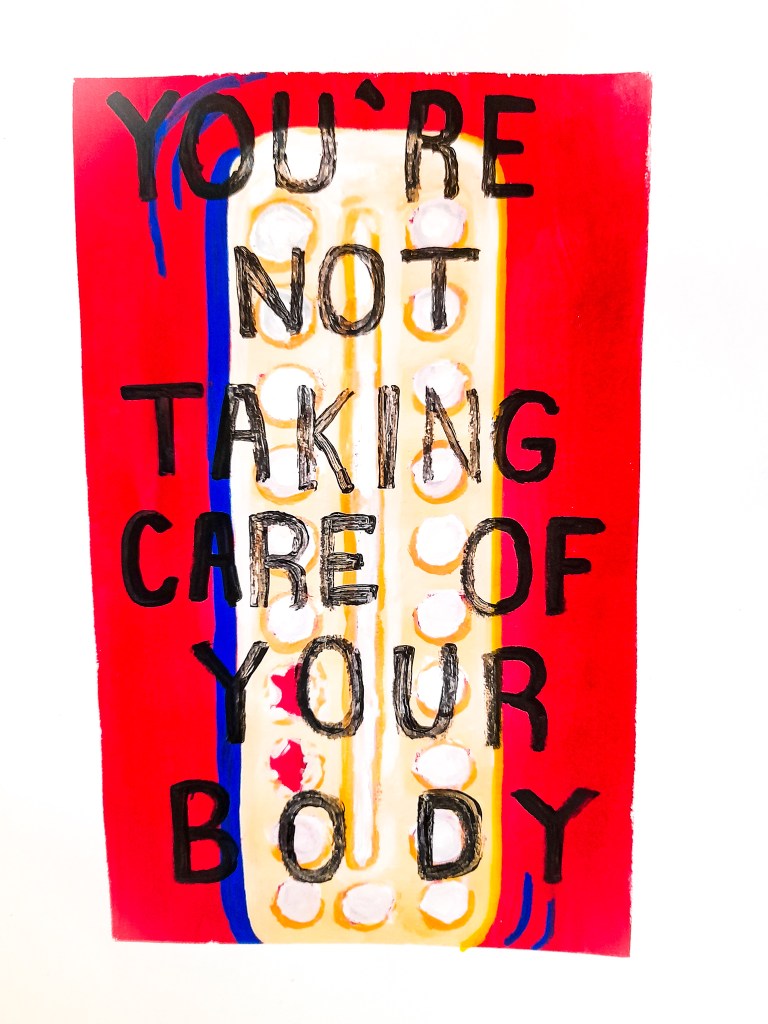 I did a sketch with gouache and watercolour of birth control pills before writing on top the horrible phrase that was spoken to me; ‘You’re not taking care of your body’. It did feel good to paint this and express my frustration after keeping it in for so long and not knowing how to deal with it. I hadn’t done much work as I was struggling to cope but this piece helped me get back into the swing of things. I wasn’t sure if this was an idea I wanted to pursue so publicly with my art but it felt good to begin exploring there.