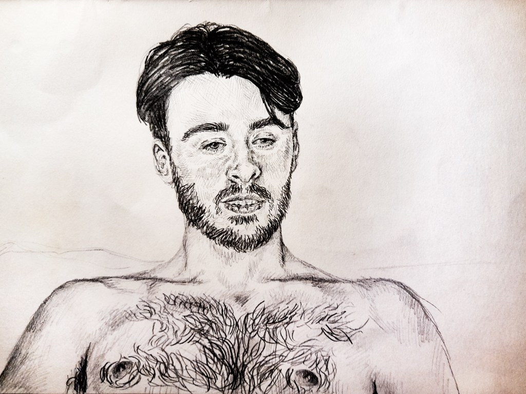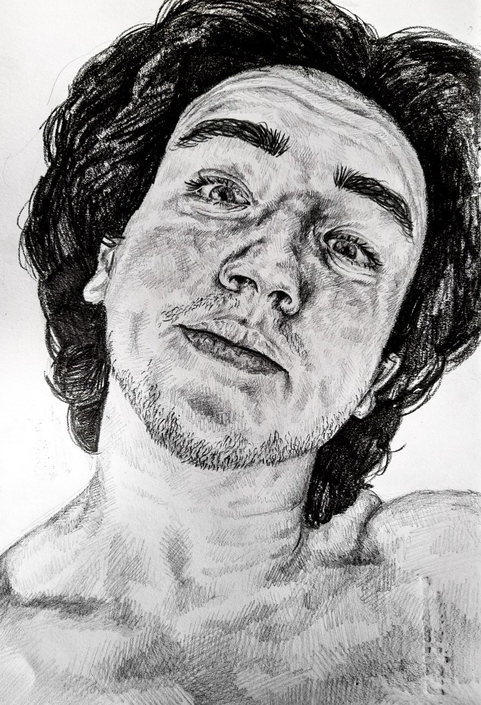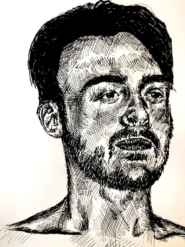 I began with a pencil drawing, a medium I’m used to, as I looked at capturing a face I haven’t before. And I really like the result. Jay’s face is very different to Joe’s so it was interesting trying to capture his distinct, sharp features. I decided as I moved on to trying out a new medium for this project, a sharp and bold medium could suit capturing his bold facial structure quite well.