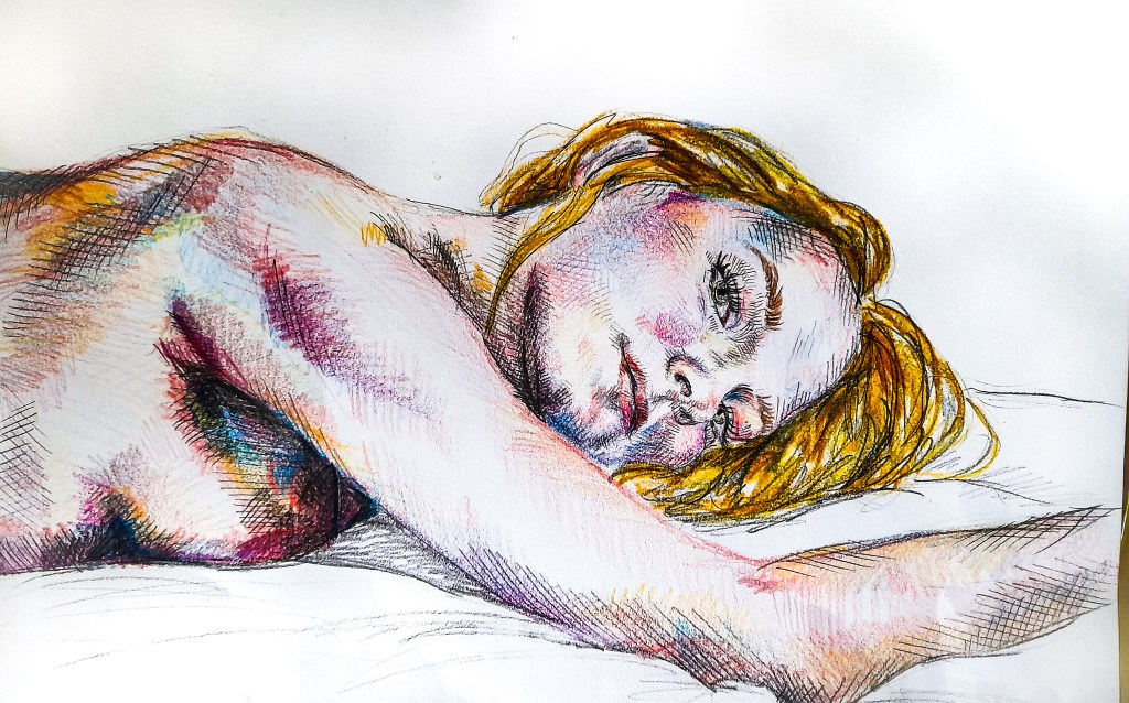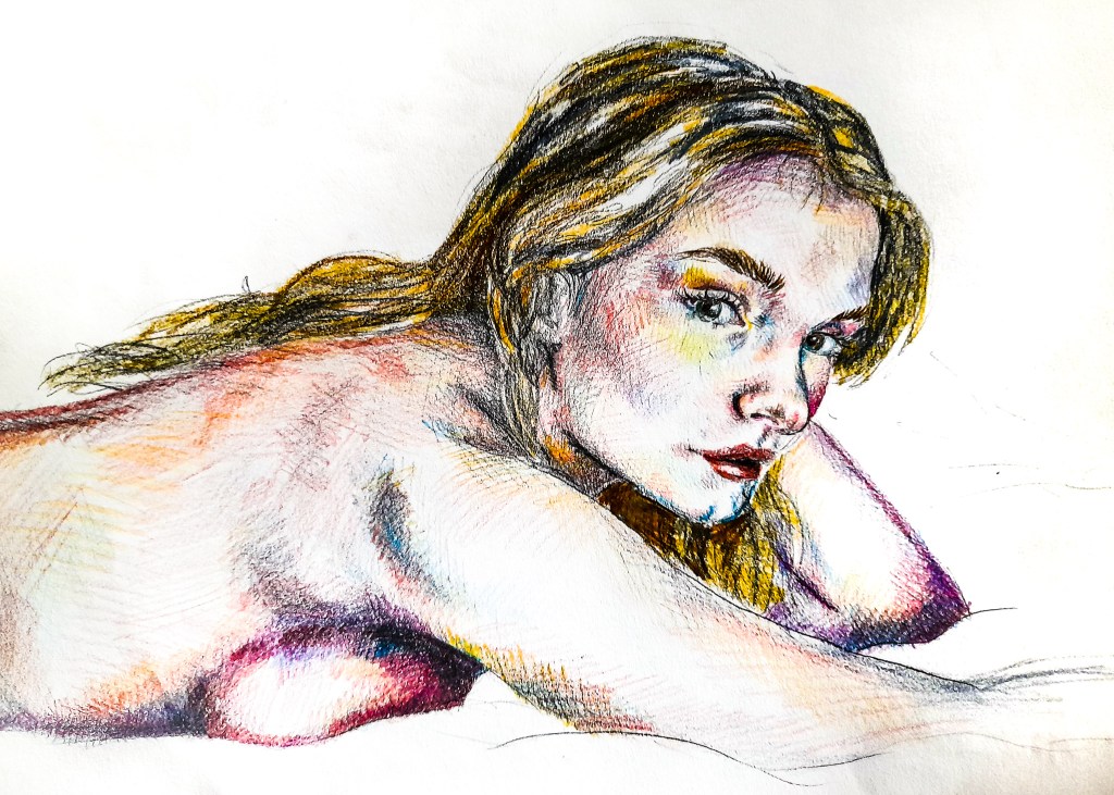 For my work I want to look at exploring the Female Gaze in a variety of ways and mediums, and look at using art depict my traumas with my body and experience with men. I want to create empathetic pieces of work that look at both the female and male body in a more intimate and loving way rather than being objectifying. I want to make art that is personal to me but is relatable to my viewers. I want my viewers to look at my work and empathise and relate to the people of my portraits. I will be working on a lot of self portraits and how I view my body and also looking at a male body and depicting it in a romantic way. Through a female perspective. Using friendly colours like Helen Beard could be a good way of achieving this, as it adds a friendly layer to graphic female content. Or trying to depict the essence of the person through mixed media as Emery does with her work looking at women’s aura.