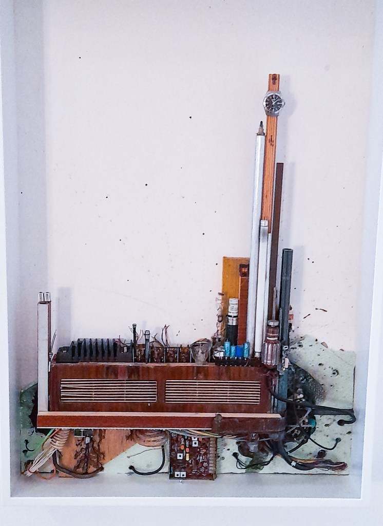Here we can see a direct advancement from the framed pieces I looked at first. He’s moved on from looking at one city building to looking at a city silhouette, a slice of a bigger scene. This piece shows how we’re all connected by these wires, pipelines architecturally but also by the technology we use. We can all find an item we can relate to that is used in this piece. For me and my boyfriend (who accompanied me to this exhibition) we both found and bonded over an old camera that was repurposed in this piece. We are all connected by technology and the internet but also by the design of our towns and cities. Again Kintera uses wires and 3D objects to add layers of texture and perspective to his work. He uses the texture of different materials, like indents and parts of a computer board to act as windows and building textures, there is a lot of detail to unpack when you’re close and personal with his work, which adds so much investment and intrigue to the viewer.
