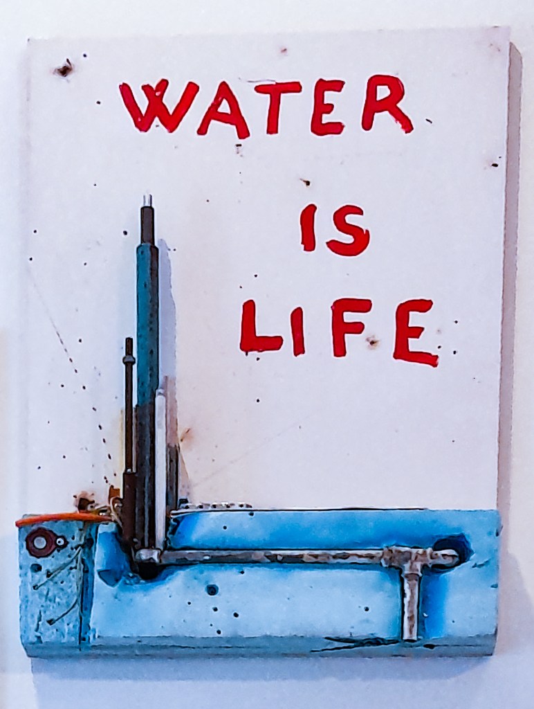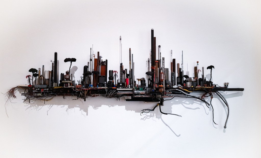 The first three pieces I picked out here were the first ones I saw in this adventure of an exhibition. They depict city scapes and buildings using recycled materials and lots of wires. One of the unique areas where Kintera stands out is his use of recycled materials to depict scenes. The vast majority of what makes up his work is recycled materials that can’t serve their purpose anymore, and Kintera gives them a beautiful new meaning by using them as art and to make his art. His depictions of city-scapes and buildings are unique not only due to what they’re made out of, but also due to how Kintera also focuses on whats underneath the city. A city isn’t just what we can see, its the invisible parts that we aren’t always aware of, like water lines, sewage pipes and electricity which reaches us and connects us underground. When we think of a city we think of the buildings we can see, not the aspects underground that make cities function and work, which is a unique take by Kintera I haven’t seen many or any landscape artists focus on. These pieces are so interesting to me as he has dissected the Urban Landscape to show us aspects of city structures we don’t always think of, and show their importance. The 3D aspects of these pieces, by using wires add so much depth and texture, you find yourself staring for a long while picking out each object he uses whether its a broken phone, wires or an old motherboard.