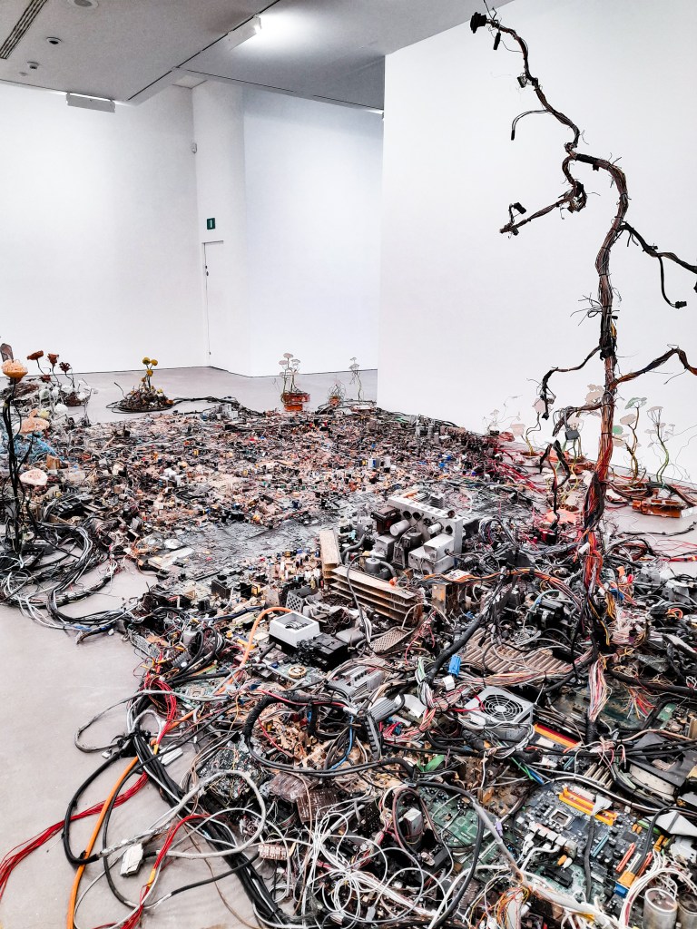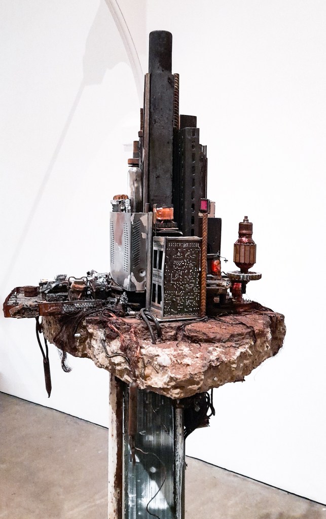 Finally we can see this growth and ideas fall into place with the final piece I will look at, this huge model city made again from recycled materials. I love how you can see his thought process and journey of ideas advance as you progress through the exhibition. There is so much to unpack visually that I found we stayed here the longest, exploring this vast city like a city in a foreign country. Familiar yet different, it was exciting seeing how he explored different landscapes with different recycled materials. Fields made from flat, green circuit boards. Cities made from old computer pieces and hardware, which depict buildings and skyscrapers from how he organises his composition. Wires connect the different cities and landscapes, joining them all together. Wired trees are present showing the need for nature, but also the absence of it in a modern and technologically advanced society. His work contains juxtaposition by showing a sci-fi, technological advanced society but made up of discarded technology that’s old and serves us no purpose anymore. From the title: ‘Postnaturalia’ we can tell that this is a city depicted after nature. There is no need for it yet we long for it. It comments on how we rely on technology more than we rely on the environment, and although we value technology, we discard it and disregard it the way we do with our natural environment.