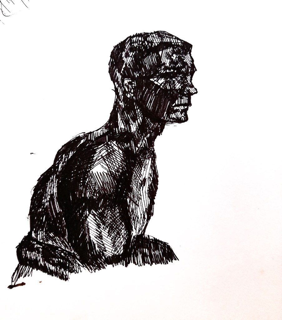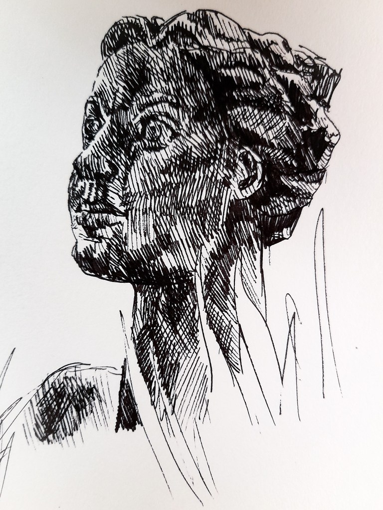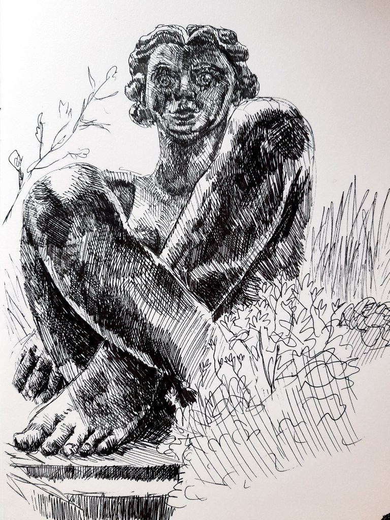 I found this statue much more interesting to depict, I loved approaching the natural dark tones and the the contrast of the shine from the glossy material. My forte is definitely portraiture so i felt more at home drawing this than my previous exercises with capturing a vast view of landscapes. I would like to perhaps explore capturing a statue for my assessment piece but this statue will not fit as there are no natural elements in the surrounding area to fit into the assessment criteria. I enjoyed capturing statues in this exercise and seeing my use of pen as a medium improve. I think I could experiment with pen and ink for my assessment piece, using pen to define the foreground and slowly bring in ink to help add depth with the middle ground and background. I can explore this idea with some preliminary sketches before deciding on what to do.