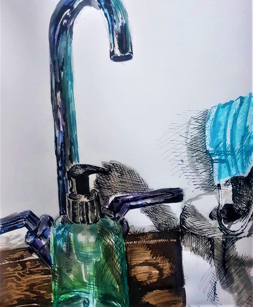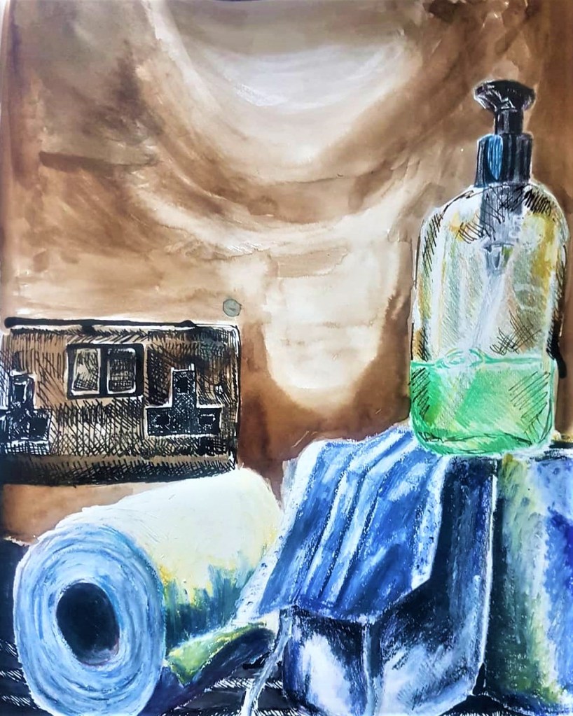 For this exercise I decided to focus on a new range of objects relating to the current situation of the pandemic. I looked at placing a mask, toilet rolls and hand soap at an angle near my sink when experimenting with what my composition could be for my first attempt at this exercise. With a good variety of textures in there, I could explore a range of interesting media and their effects, and create a unique drawing.